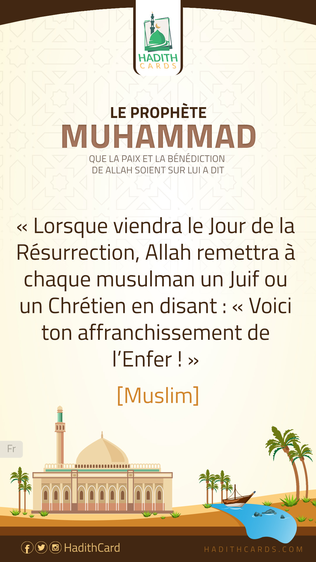 Lorsque viendra le Jour de la Résurrection, Allah remettra à chaque musulman un Juif ou un Chrétien en disant : « Voici ton affranchissement de l’Enfer !