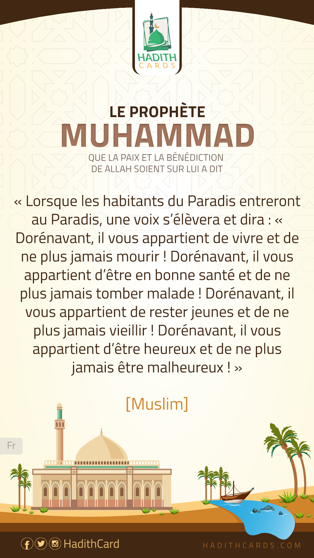Lorsque les habitants du Paradis entreront au Paradis, une voix s’élèvera et dira : « Dorénavant, il vous appartient de vivre et de ne plus jamais mourir ! Dorénavant, il vous appartient d’être en bonne santé et de ne plus jamais tomber malade ! Dorénavant, il vous appartient de rester jeunes et de ne plus jamais vieillir ! Dorénavant, il vous appartient d’être heureux et de ne plus jamais être malheureux !