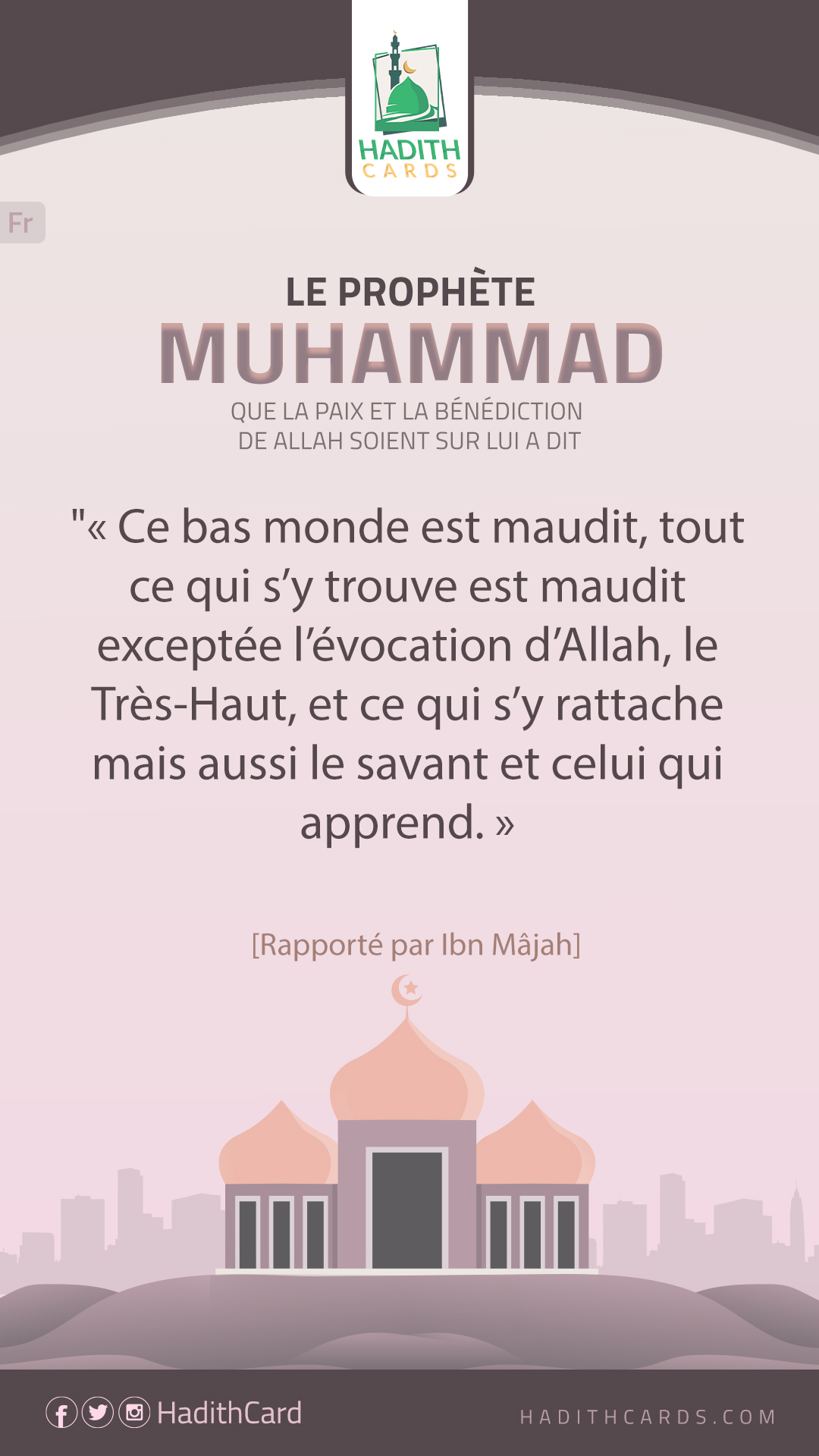 Ce bas monde est maudit, tout ce qui s’y trouve est maudit exceptée l’évocation d’Allah, le Très-Haut, et ce qui s’y rattache mais aussi le savant et celui qui apprend