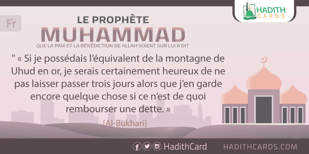 Si je possédais l’équivalent de la montagne de Uhud en or, je serais certainement heureux de ne pas laisser passer trois jours alors que j’en garde encore quelque chose si ce n’est de quoi rembourser une dette