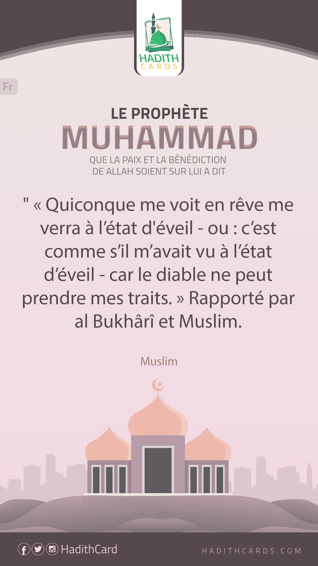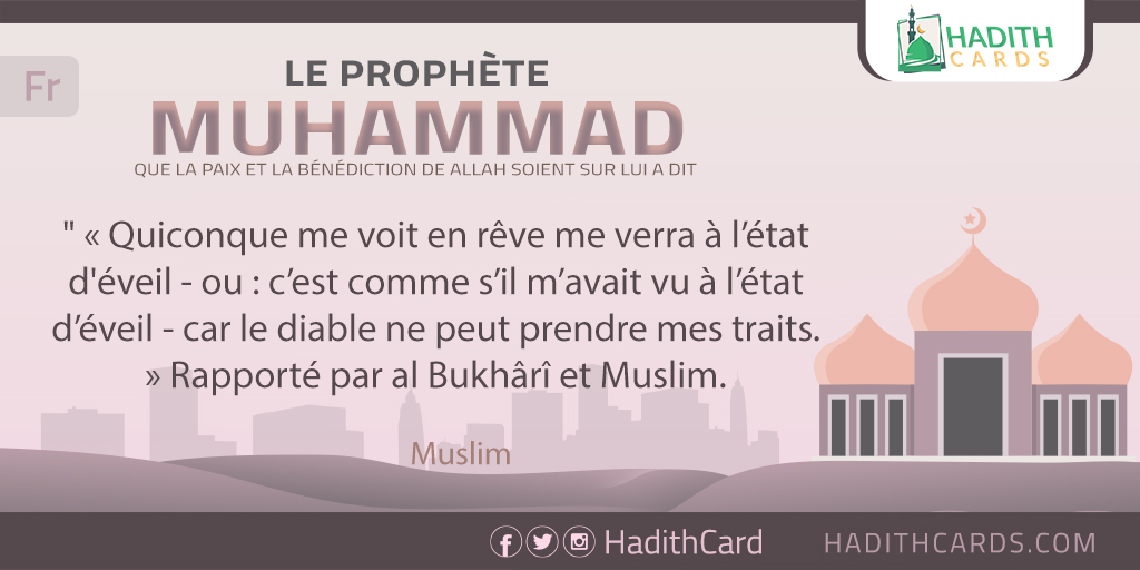 Quiconque me voit en rêve me verra à l’état d'éveil - ou : c’est comme s’il m’avait vu à l’état d’éveil - car le diable ne peut prendre mes traits. » Rapporté par al Bukhârî et Muslim