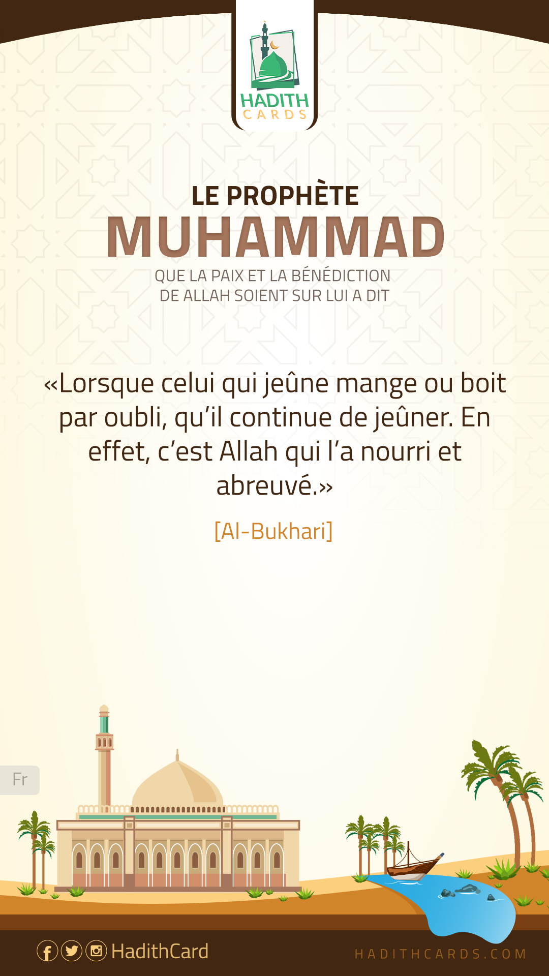 Lorsque celui qui jeûne mange ou boit par oubli, qu’il continue de jeûner. En effet, c’est Allah qui l’a nourri et abreuvé