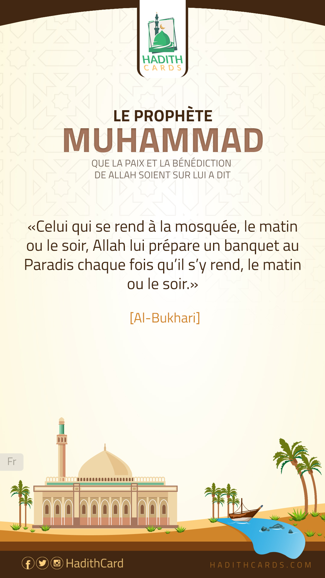 Celui qui se rend à la mosquée, le matin ou le soir, Allah lui prépare un banquet au Paradis chaque fois qu’il s’y rend, le matin ou le soir