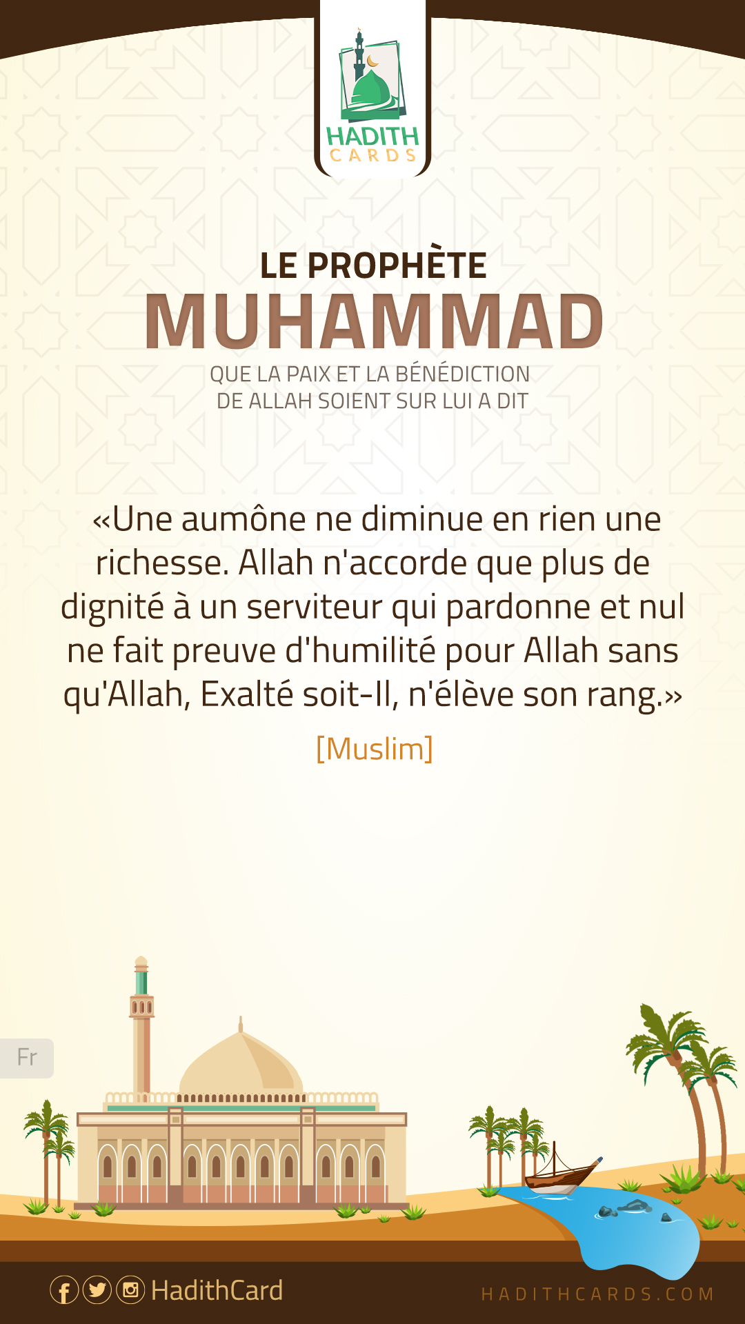 Une aumône ne diminue en rien une richesse. Allah n'accorde que plus de dignité à un serviteur qui pardonne et nul ne fait preuve d'humilité pour Allah sans qu'Allah, Exalté soit-Il, n'élève son rang