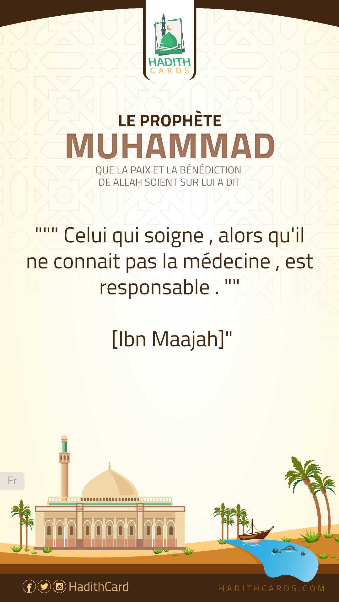 "«مَنْ تَطَبَّبَ، ولا يُعْلَمُ مِنْهُ طِبٌّ، فهو ضامِنٌ» [حسن.] - [رواه أبوداود والنسائي وابن ماجه.]"