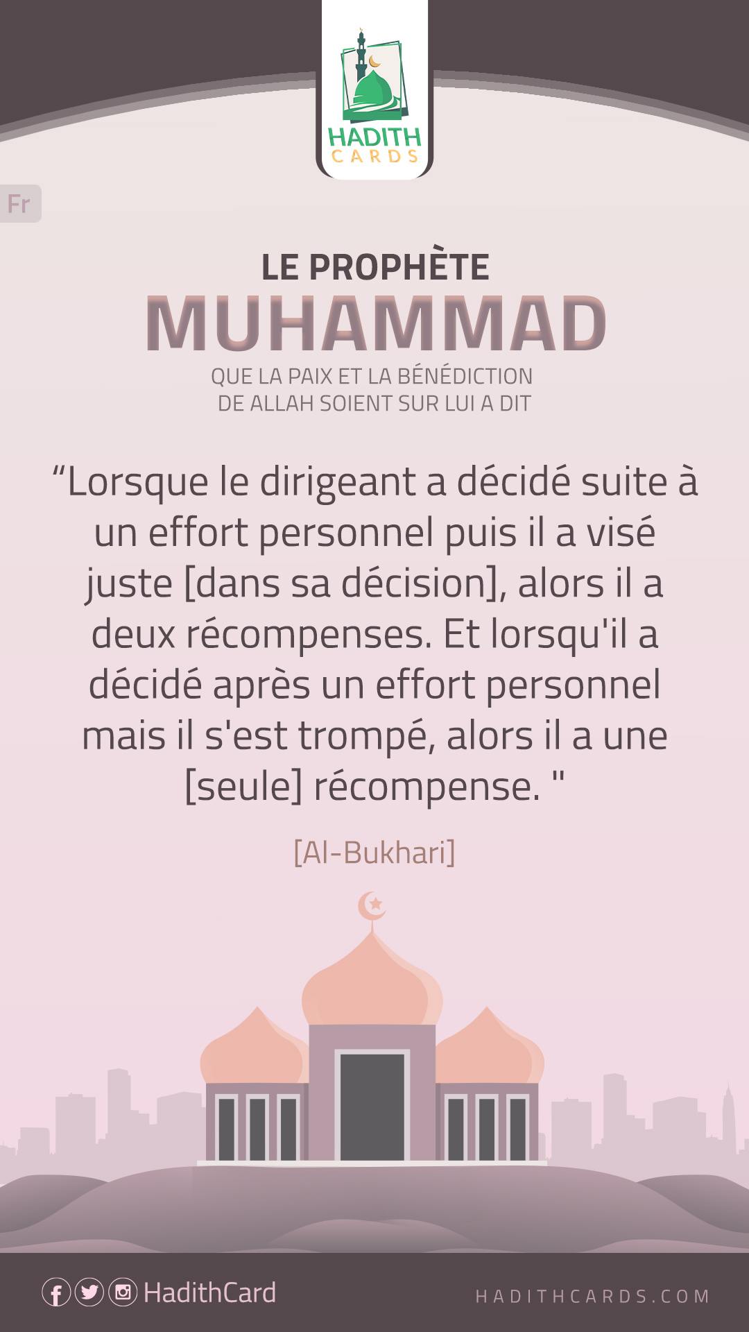Lorsque le dirigeant a décidé suite à un effort personnel puis il a visé juste [dans sa décision], alors il a deux récompenses. Et lorsqu'il a décidé après un effort personnel mais il s'est trompé, alors il a une [seule] récompense