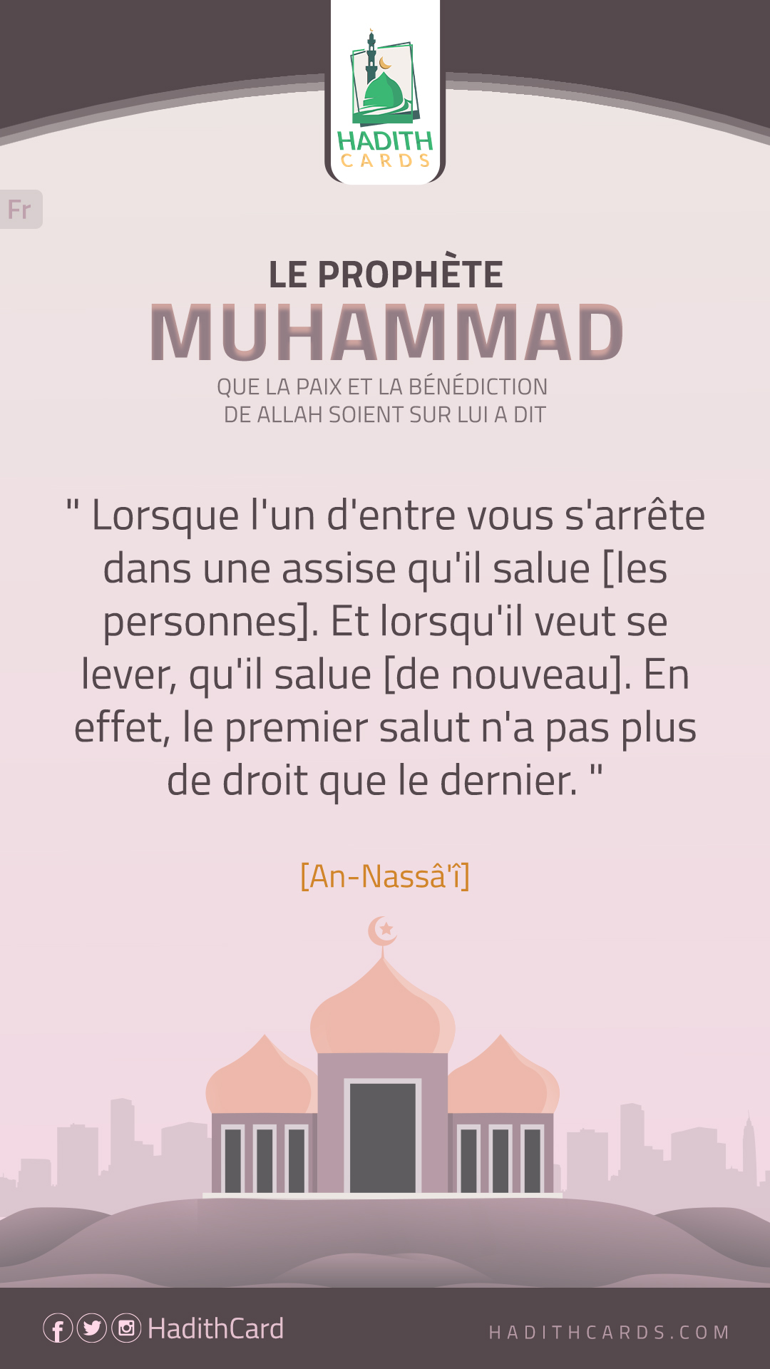 Lorsque l'un d'entre vous s'arrête dans une assise qu'il salue [les personnes]. Et lorsqu'il veut se lever, qu'il salue [de nouveau]. En effet, le premier salut n'a pas plus de droit que le dernier