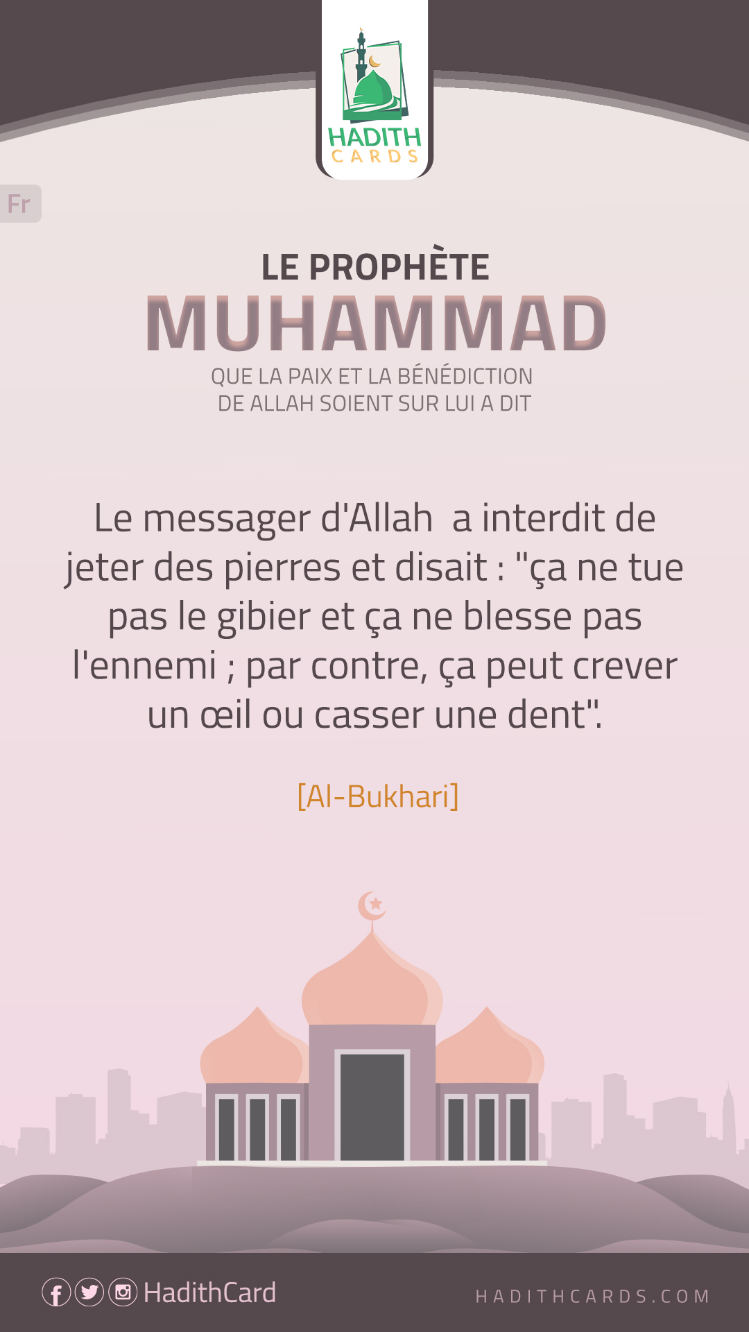 relate que le messager d'Allah a interdit de jeter des pierres et disait : "ça ne tue pas le gibier et ça ne blesse pas l'ennemi ; par contre, ça peut crever un œil ou casser une dent