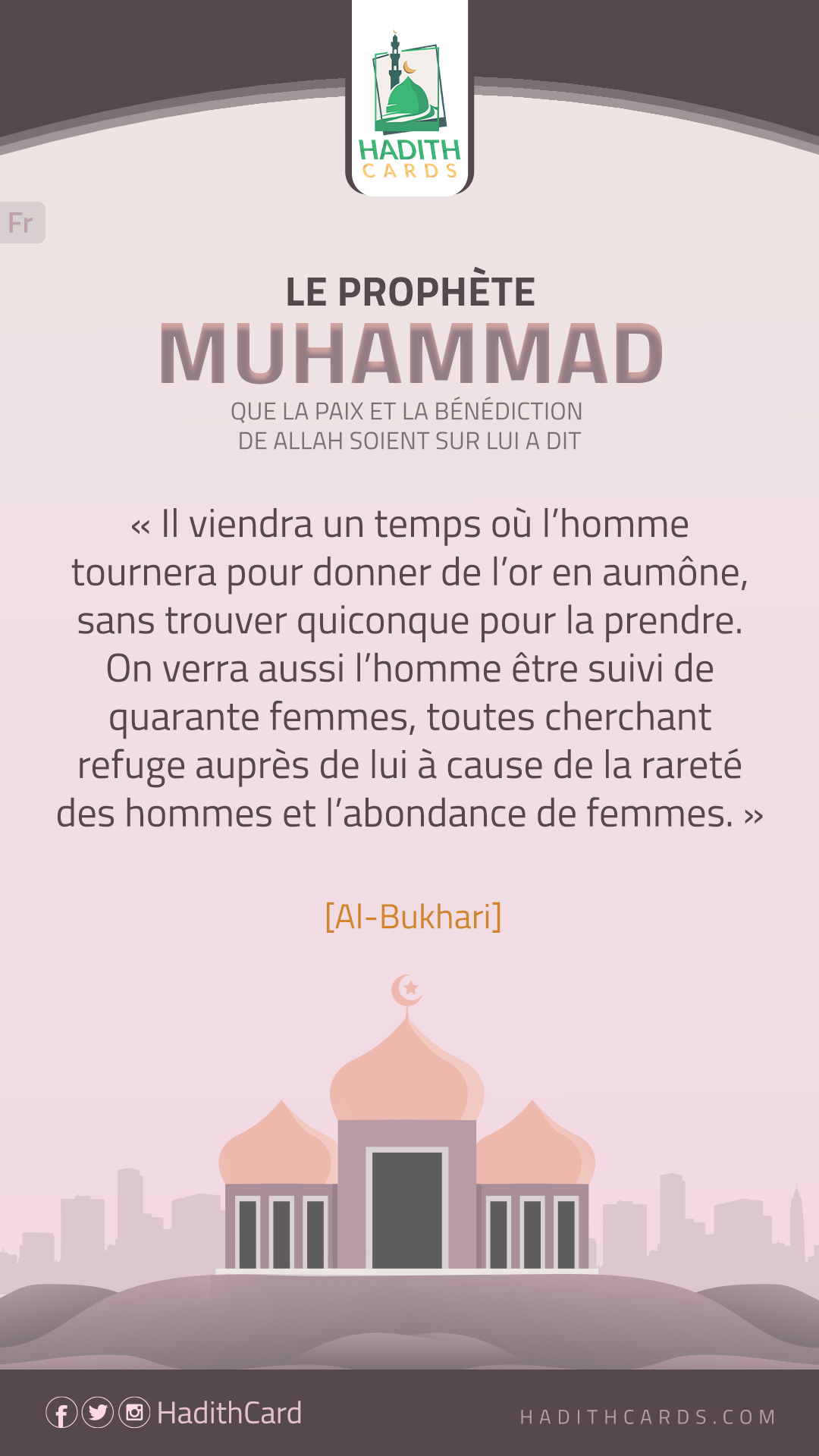 Il viendra un temps où l’homme tournera pour donner de l’or en aumône, sans trouver quiconque pour la prendre. On verra aussi l’homme être suivi de quarante femmes, toutes cherchant refuge auprès de lui à cause de la rareté des hommes et l’abondance de femmes
