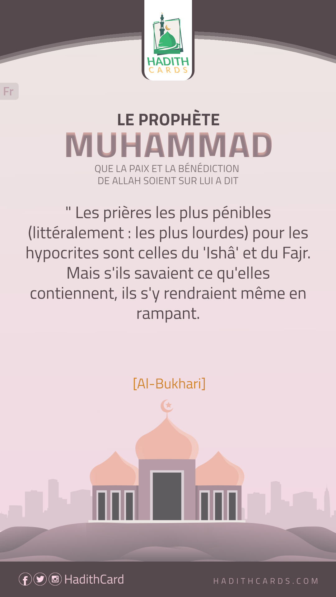 Les prières les plus pénibles (littéralement : les plus lourdes) pour les hypocrites sont celles du 'Ishâ' et du Fajr. Mais s'ils savaient ce qu'elles contiennent, ils s'y rendraient même en rampant