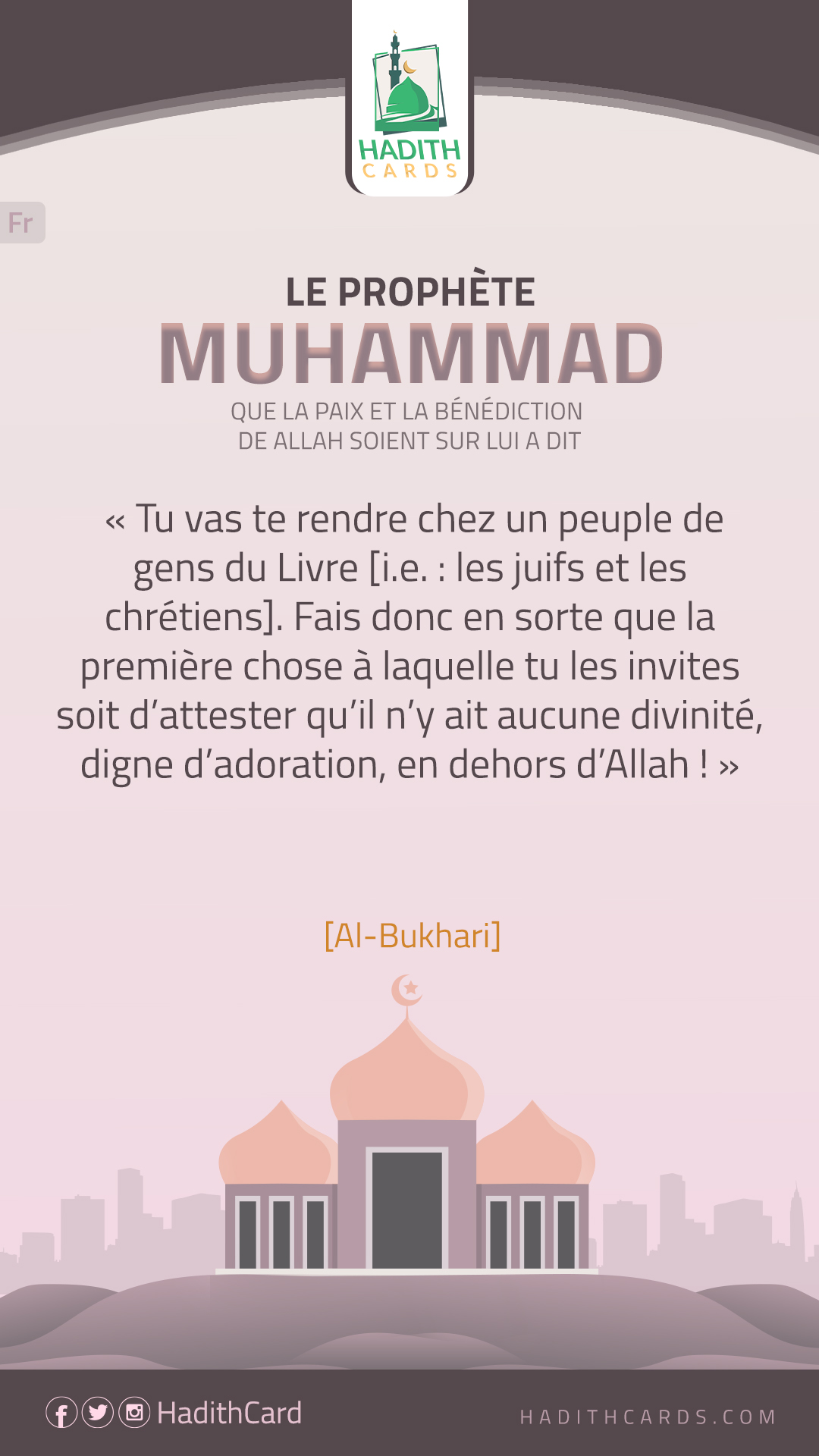 Tu vas te rendre chez un peuple de gens du Livre [i.e. : les juifs et les chrétiens]. Fais donc en sorte que la première chose à laquelle tu les invites soit d’attester qu’il n’y ait aucune divinité, digne d’adoration, en dehors d’Allah !