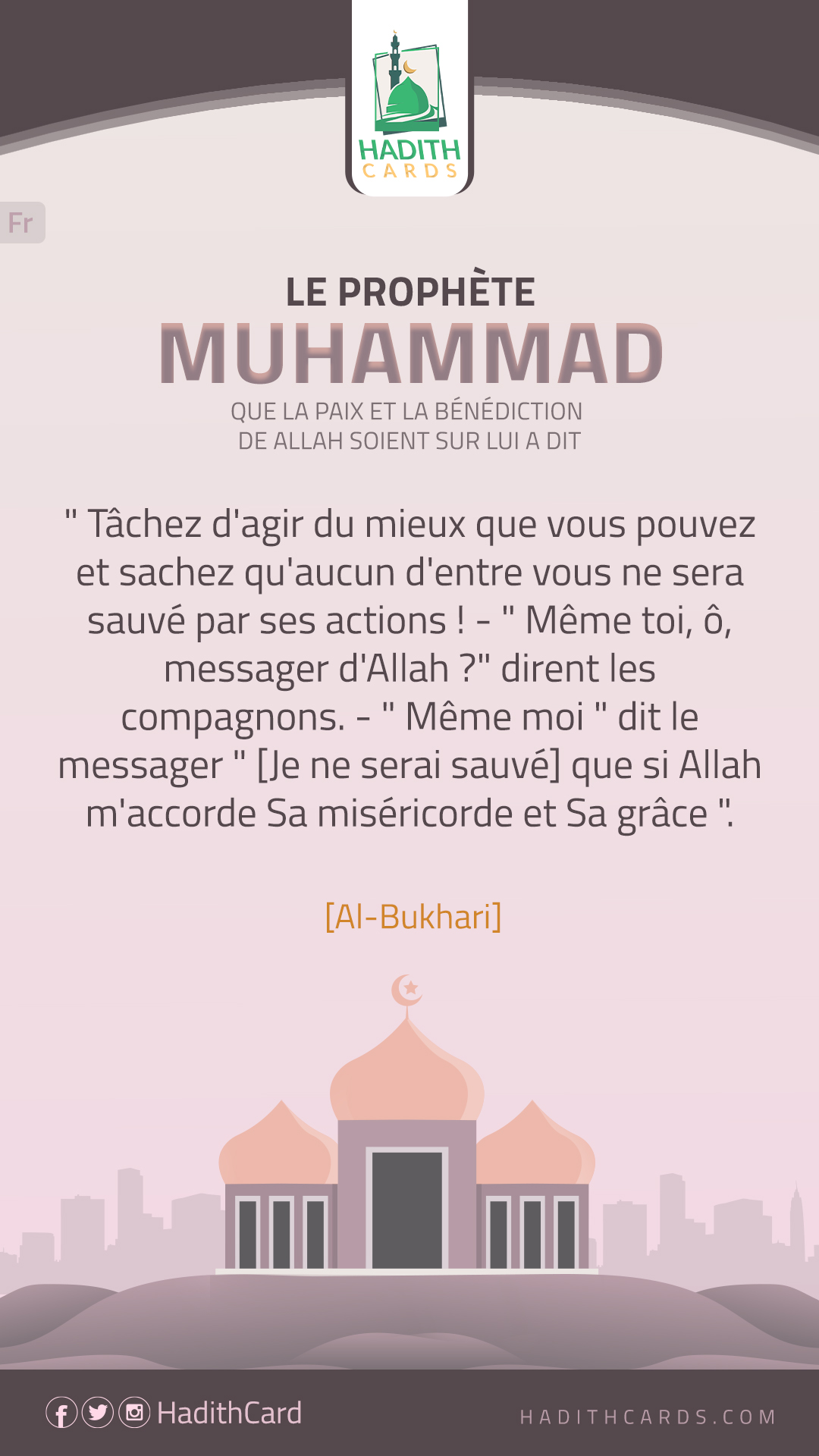Tâchez d'agir du mieux que vous pouvez et sachez qu'aucun d'entre vous ne sera sauvé par ses actions ! - " Même toi, ô, messager d'Allah ?" dirent les compagnons. - " Même moi " dit le messager " [Je ne serai sauvé] que si Allah m'accorde Sa miséricorde et Sa grâce
