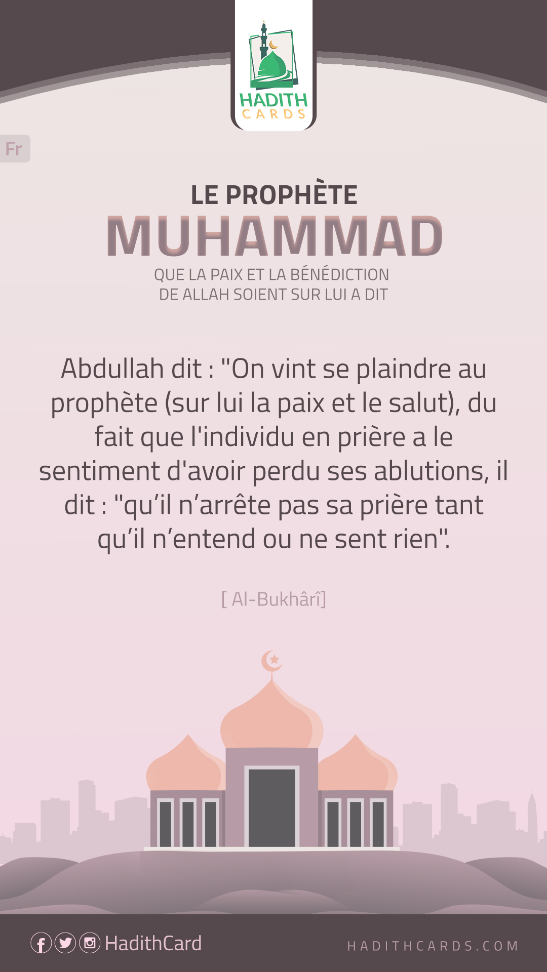 Abdullah dit : "On vint se plaindre au prophète (sur lui la paix et le salut), du fait que l'individu en prière a le sentiment d'avoir perdu ses ablutions, il dit : "qu’il n’arrête pas sa prière tant qu’il n’entend ou ne sent rien
