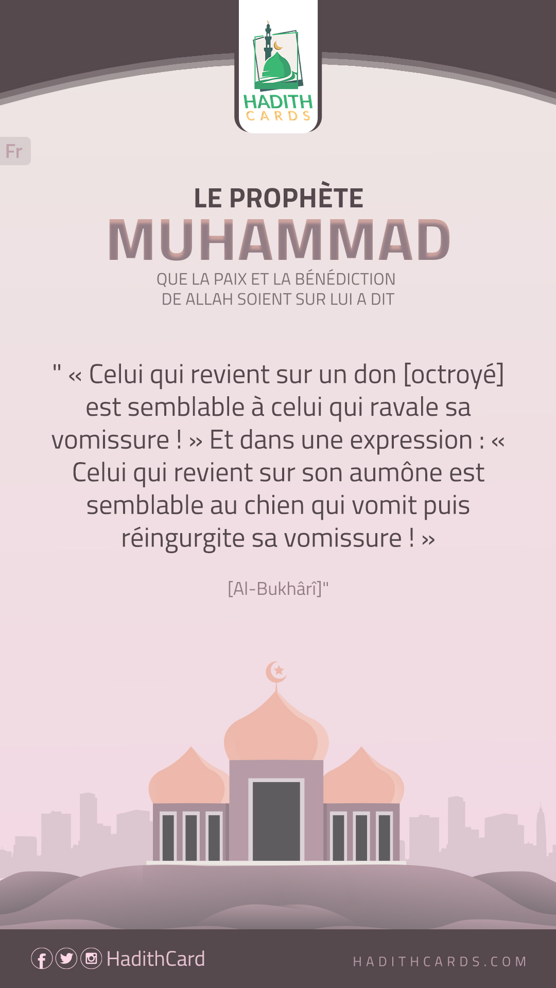 Celui qui revient sur un don [octroyé] est semblable à celui qui ravale sa vomissure ! » Et dans une expression : « Celui qui revient sur son aumône est semblable au chien qui vomit puis réingurgite sa vomissure !