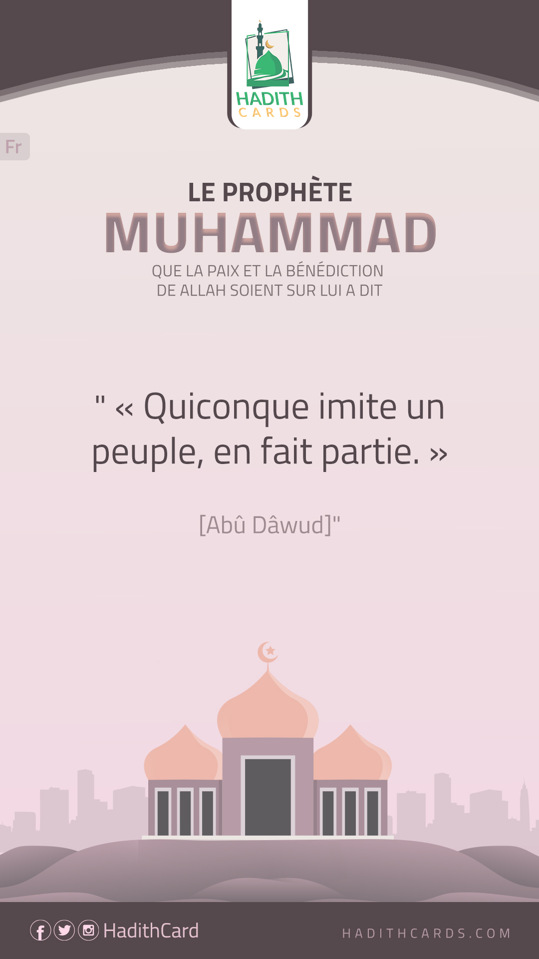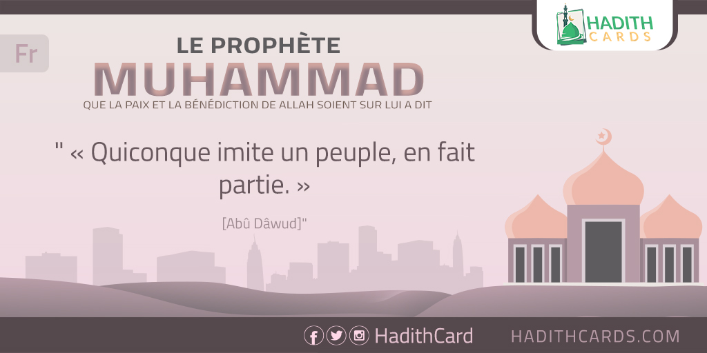 "عن عبد الله بن عمر -رضي الله عنهما- عن النبي -صلى الله عليه وسلم-قال: «من تَشبَّه بقوم, فهو منهم». [حسن.] - [رواه أبو داود وأحمد.]"