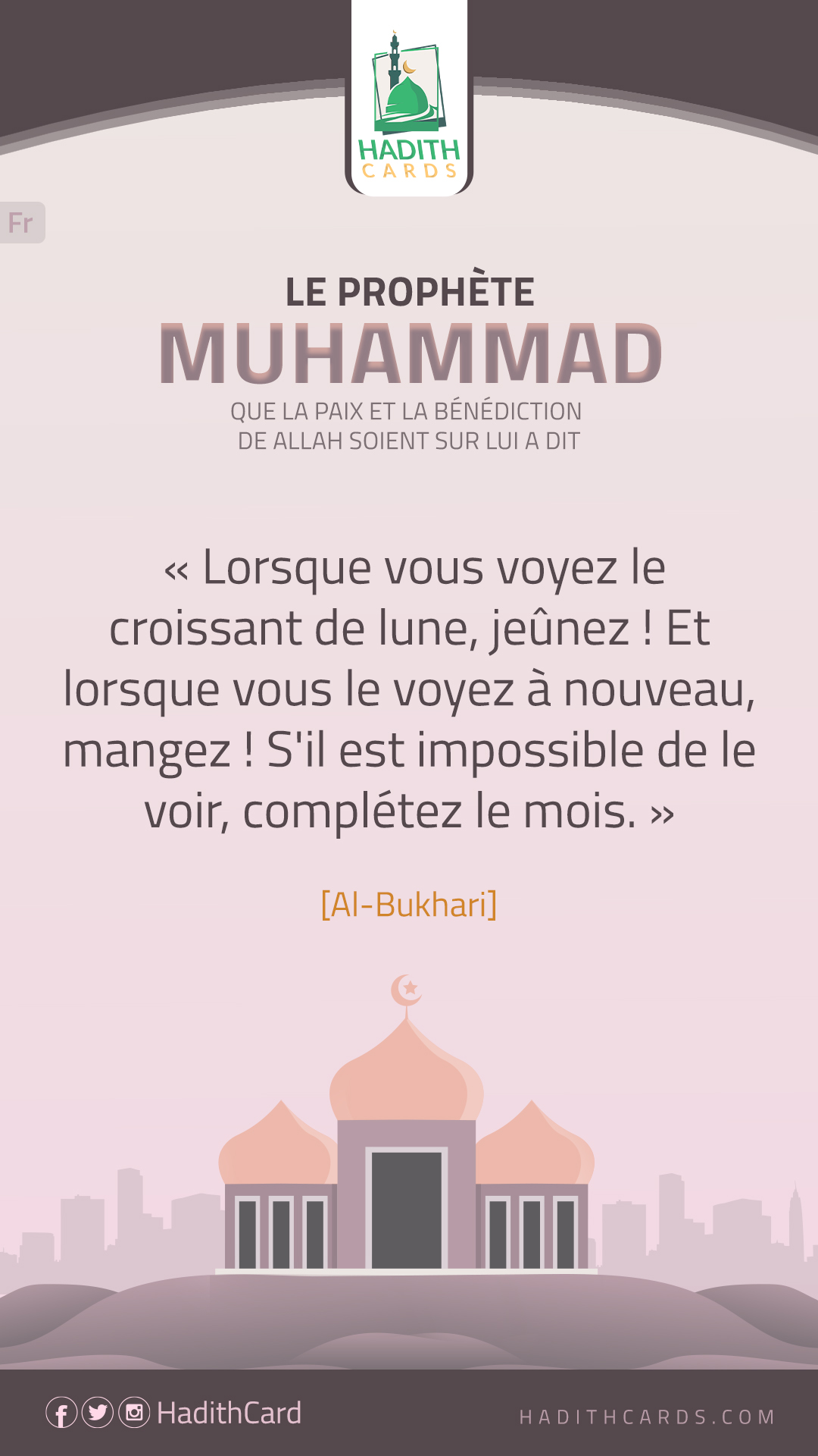 relate que le Messager d'Allah (sur lui la paix et le salut) a dit : « Lorsque vous voyez le croissant de lune, jeûnez ! Et lorsque vous le voyez à nouveau, mangez ! S'il est impossible de le voir, complétez le mois