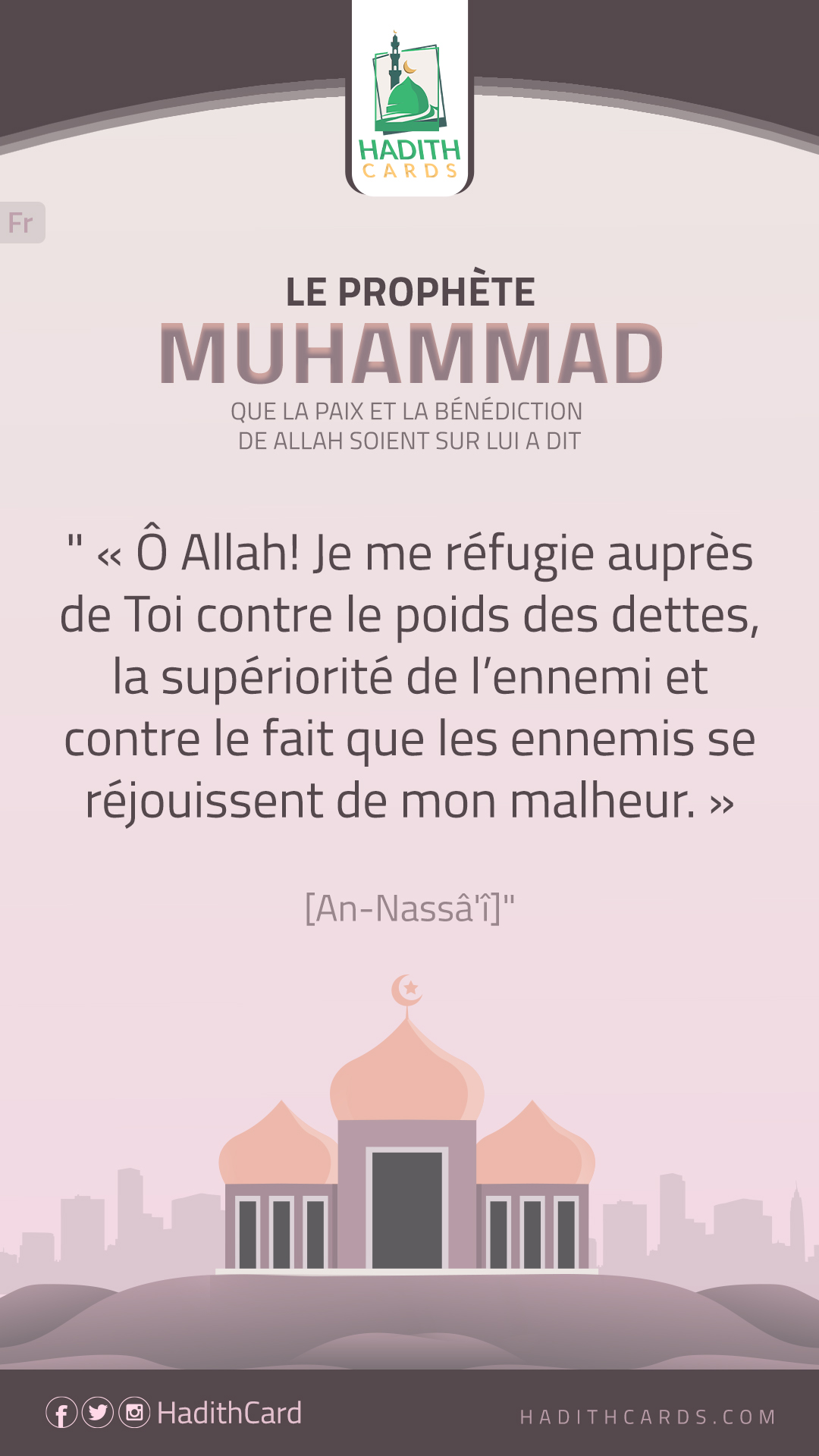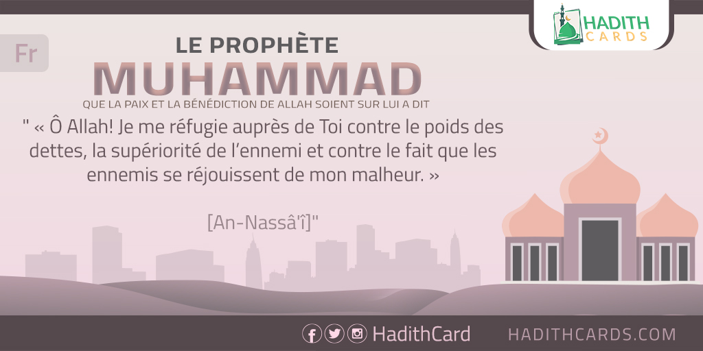Ô Allah! Je me réfugie auprès de Toi contre le poids des dettes, la supériorité de l’ennemi et contre le fait que les ennemis se réjouissent de mon malheur