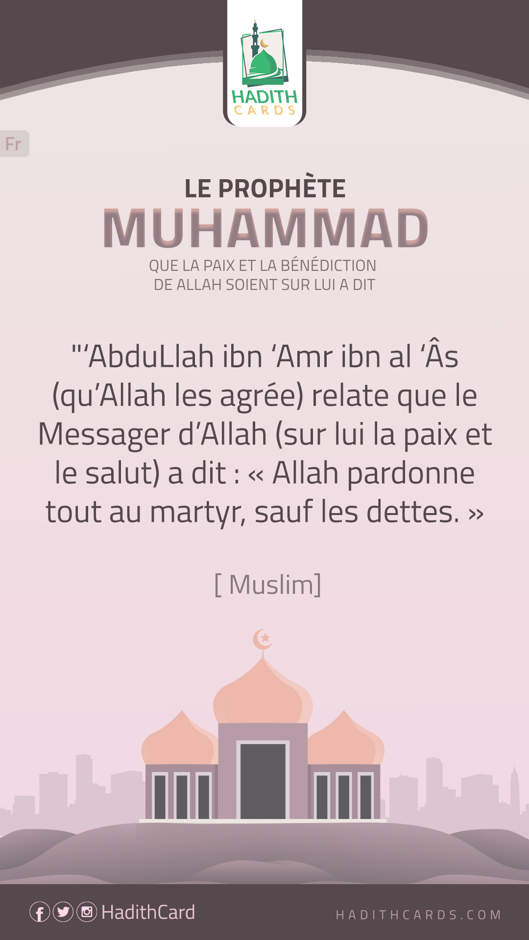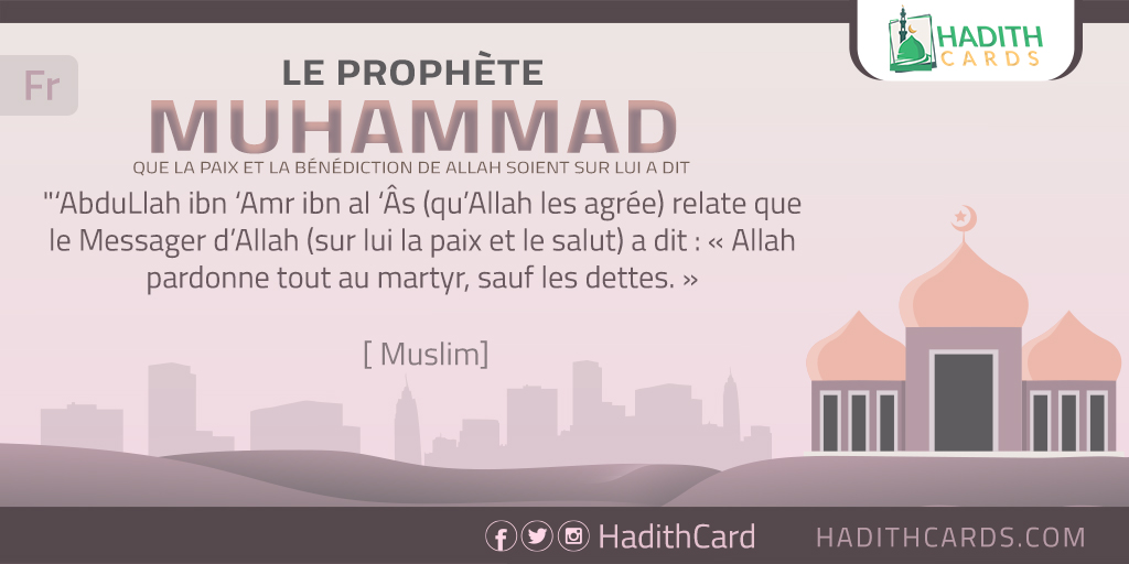 AbduLlah ibn ‘Amr ibn al ‘Âs (qu’Allah les agrée) relate que le Messager d’Allah (sur lui la paix et le salut) a dit : « Allah pardonne tout au martyr, sauf les dettes