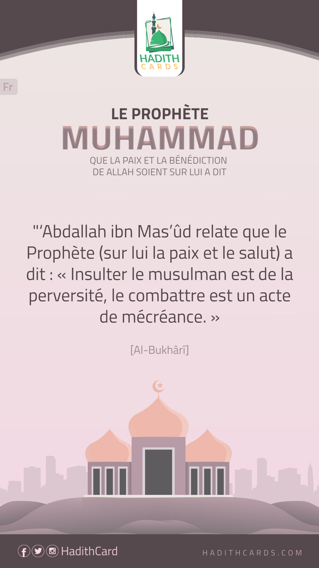Abdallah ibn Mas’ûd relate que le Prophète (sur lui la paix et le salut) a dit : « Insulter le musulman est de la perversité, le combattre est un acte de mécréance