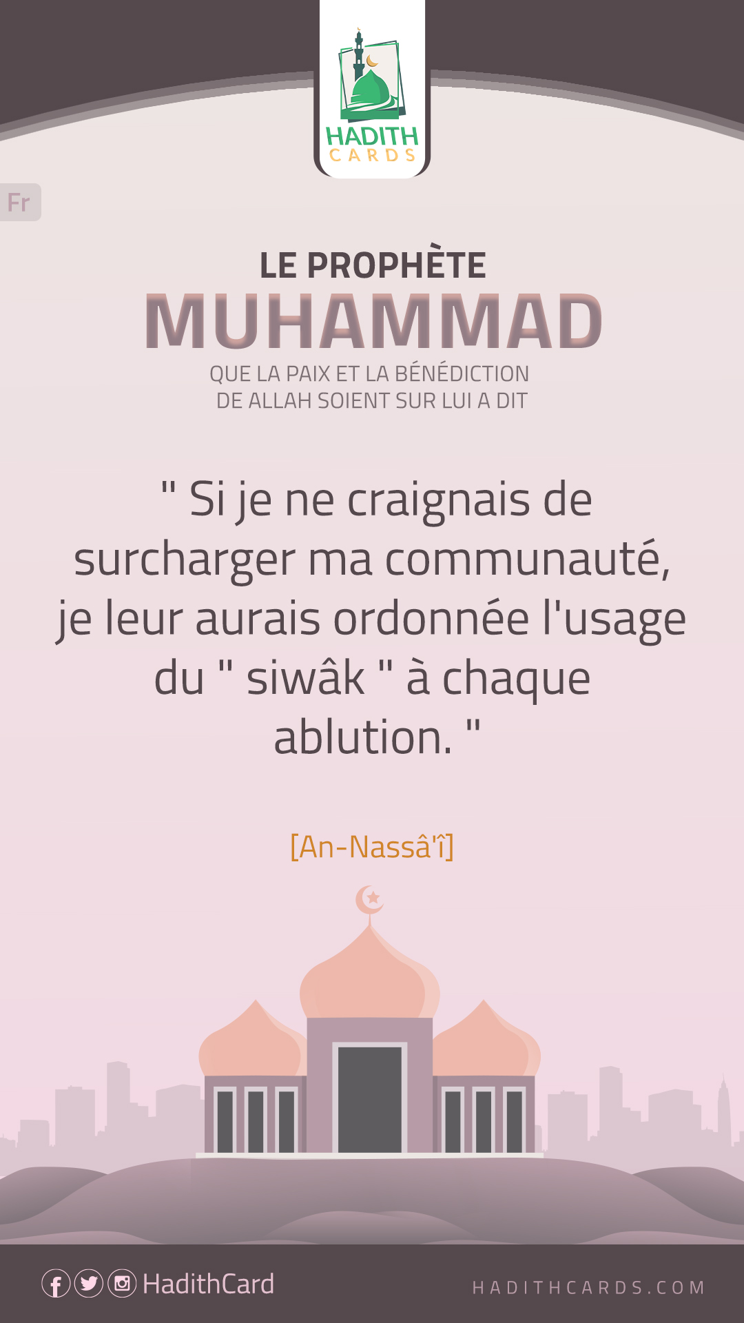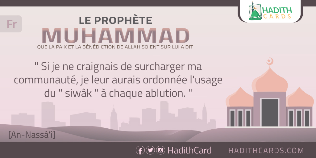 Si je ne craignais de surcharger ma communauté, je leur aurais ordonnée l'usage du " siwâk " à chaque ablution