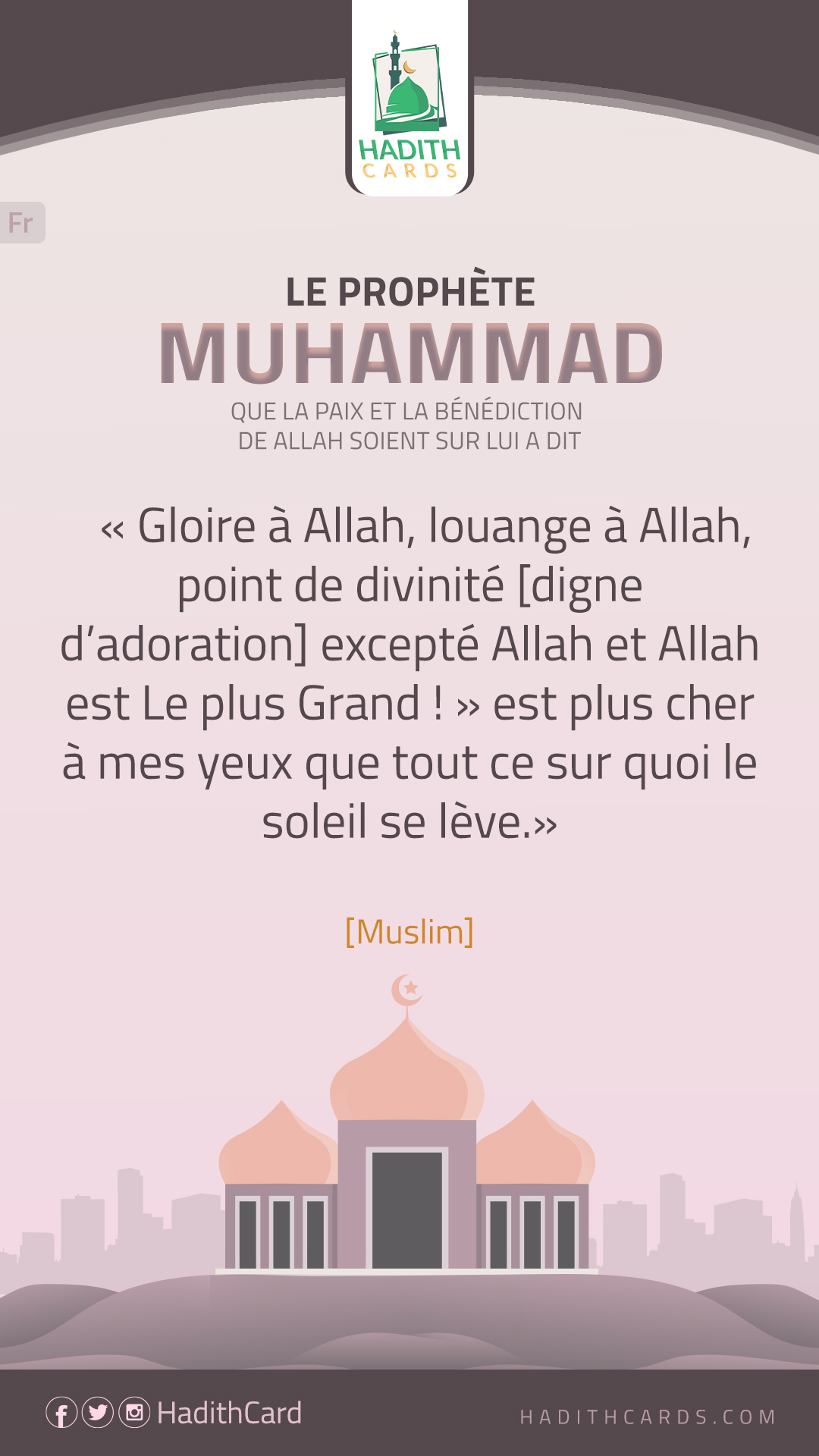 Gloire à Allah, louange à Allah, point de divinité [digne d’adoration] excepté Allah et Allah est Le plus Grand ! » est plus cher à mes yeux que tout ce sur quoi le soleil se lève