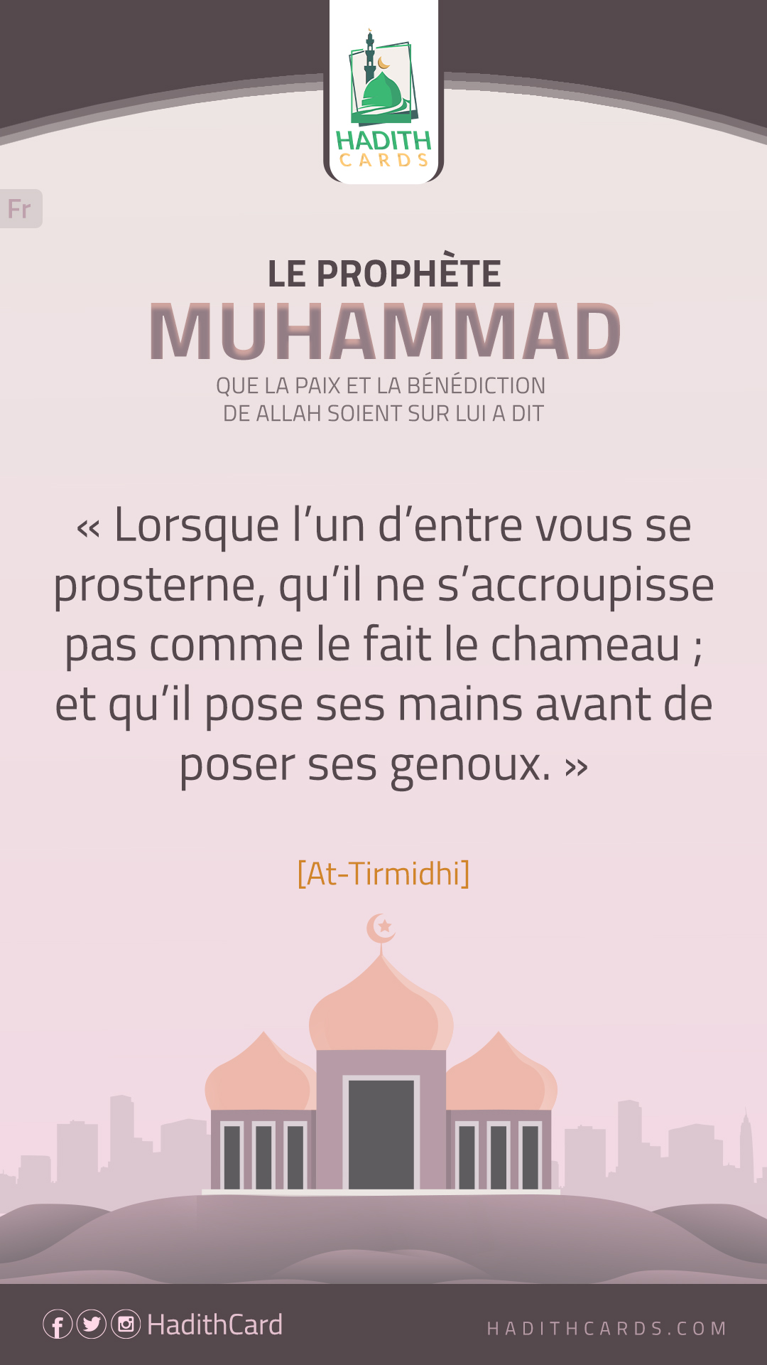 Lorsque l’un d’entre vous se prosterne, qu’il ne s’accroupisse pas comme le fait le chameau ; et qu’il pose ses mains avant de poser ses genoux