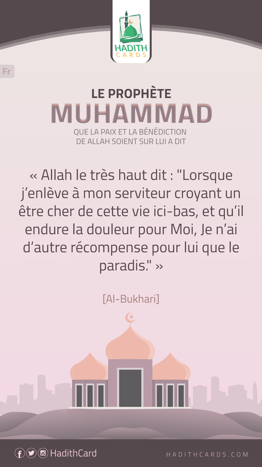 Allah le très haut dit : "Lorsque j’enlève à mon serviteur croyant un être cher de cette vie ici-bas, et qu’il endure la douleur pour Moi, Je n’ai d’autre récompense pour lui que le paradis