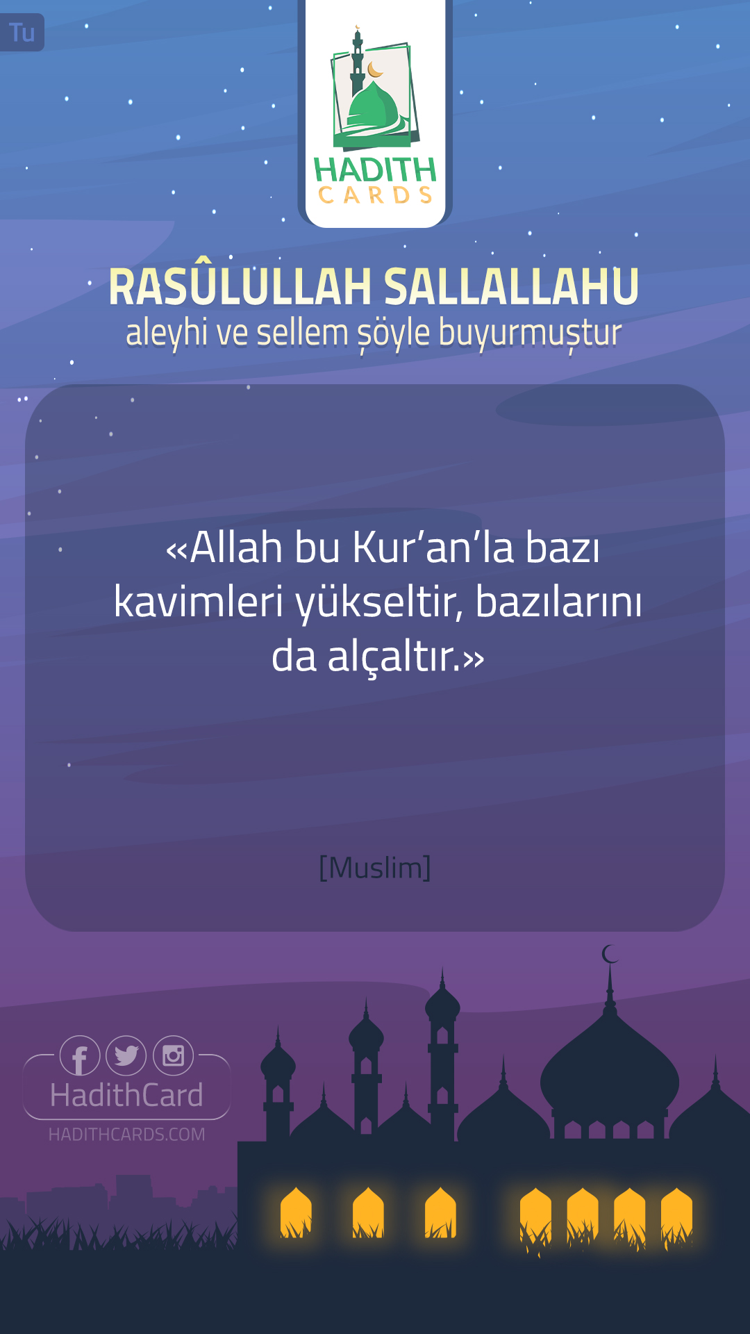 عن عمر بن الخطاب -رضي الله عنه-: أن النبي ﷺ قال: «إن اللهَ يَرفعُ بهذا الكِتابِ أقْواماً ويَضَعُ به آخَرِينَ». رواه مسلم