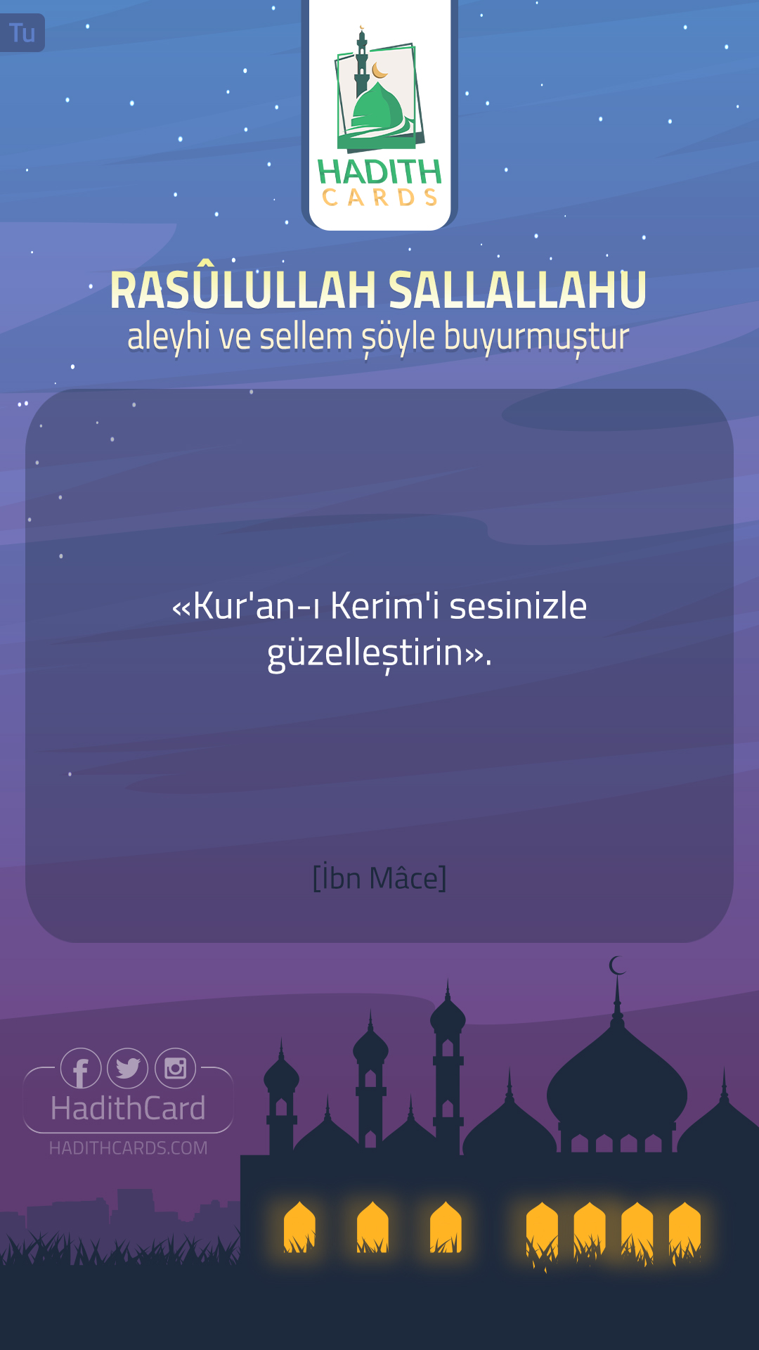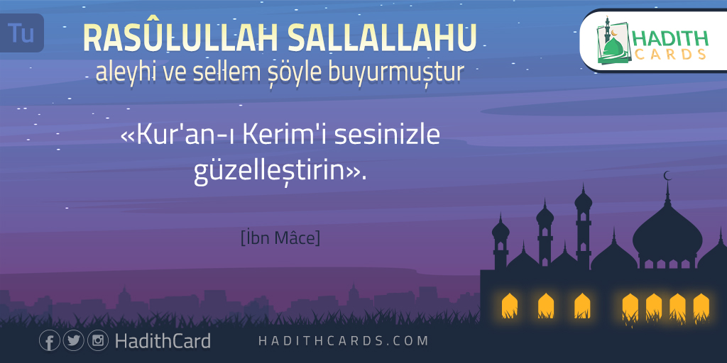قَالَ رَسُولُ اللَّهِ ﷺ «زَيِّنُوا القرآنَ بأصواتِكم».رواه أحمد، وأبو داود، والنسائي، وابن ماجه