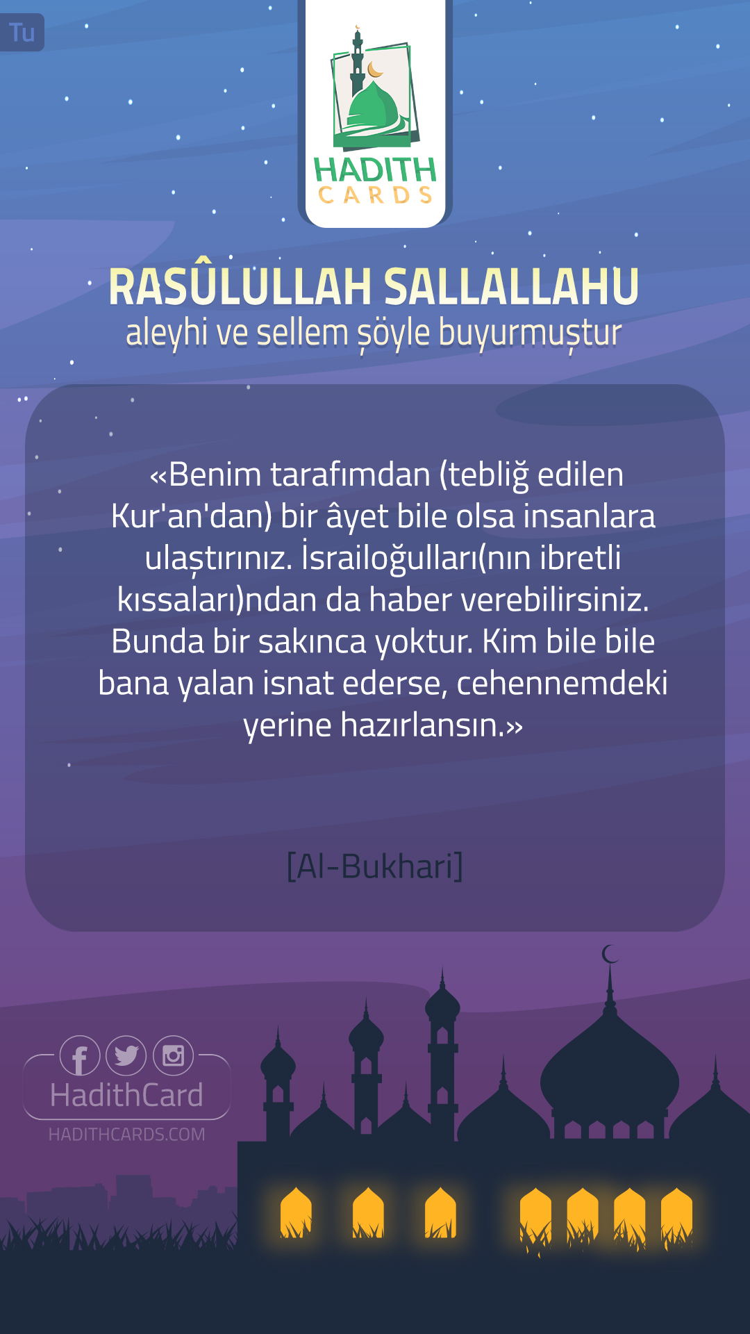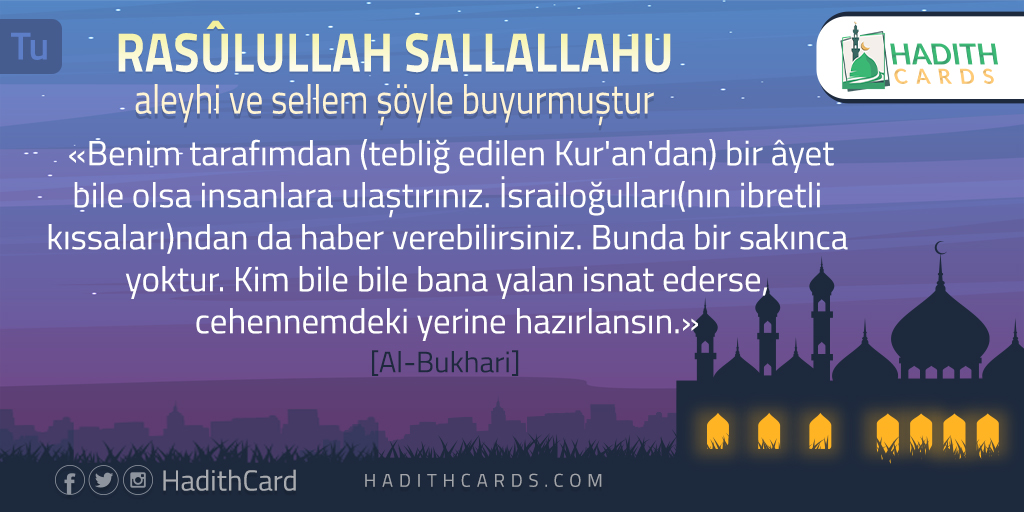 Benim tarafımdan (tebliğ edilen Kur'an'dan) bir âyet bile olsa insanlara ulaştırınız. İsrailoğulları(nın ibretli kıssaları)ndan da haber verebilirsiniz. Bunda bir sakınca yoktur. Kim bile bile bana yalan isnat ederse, cehennemdeki yerine hazırlansın