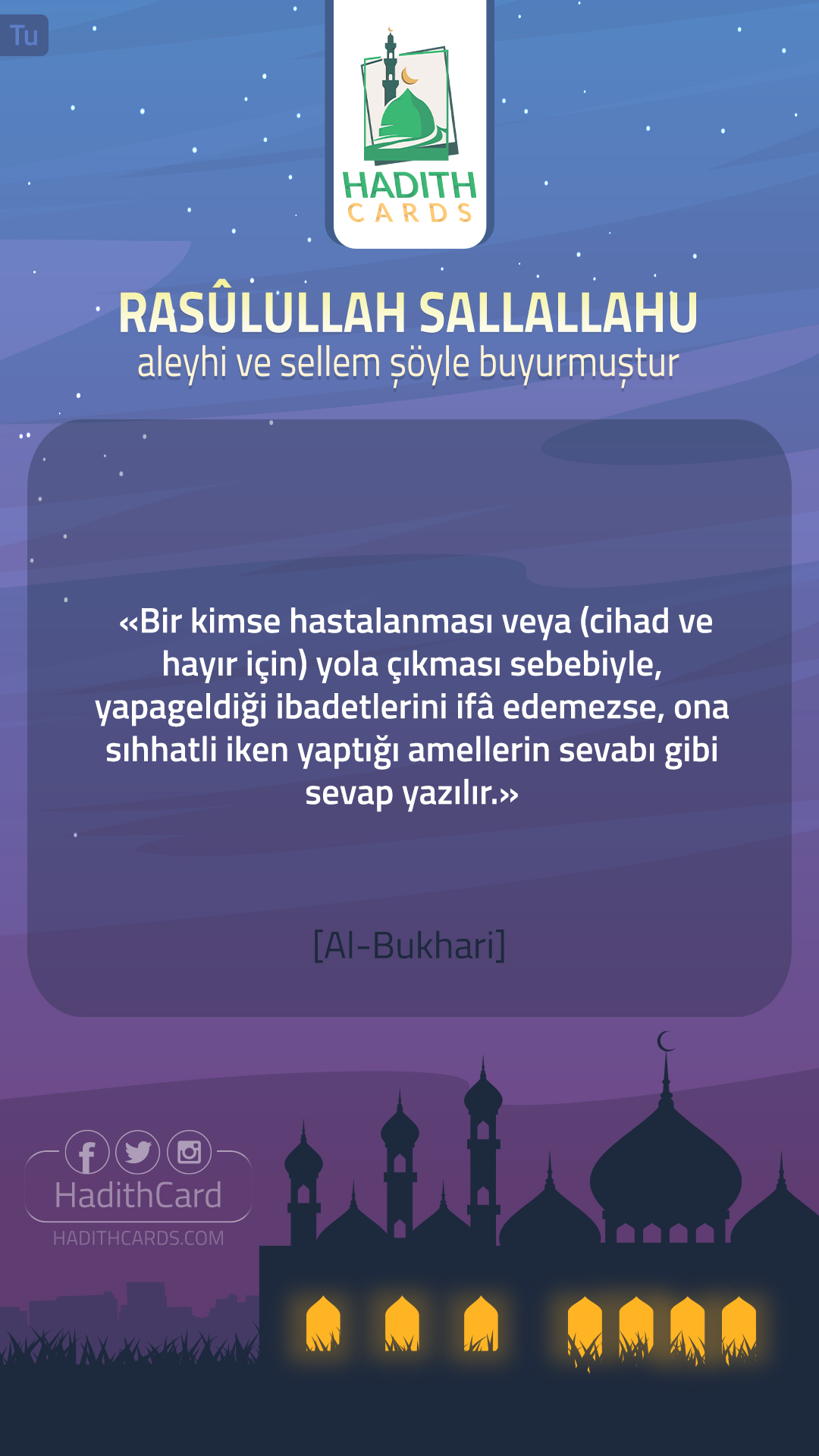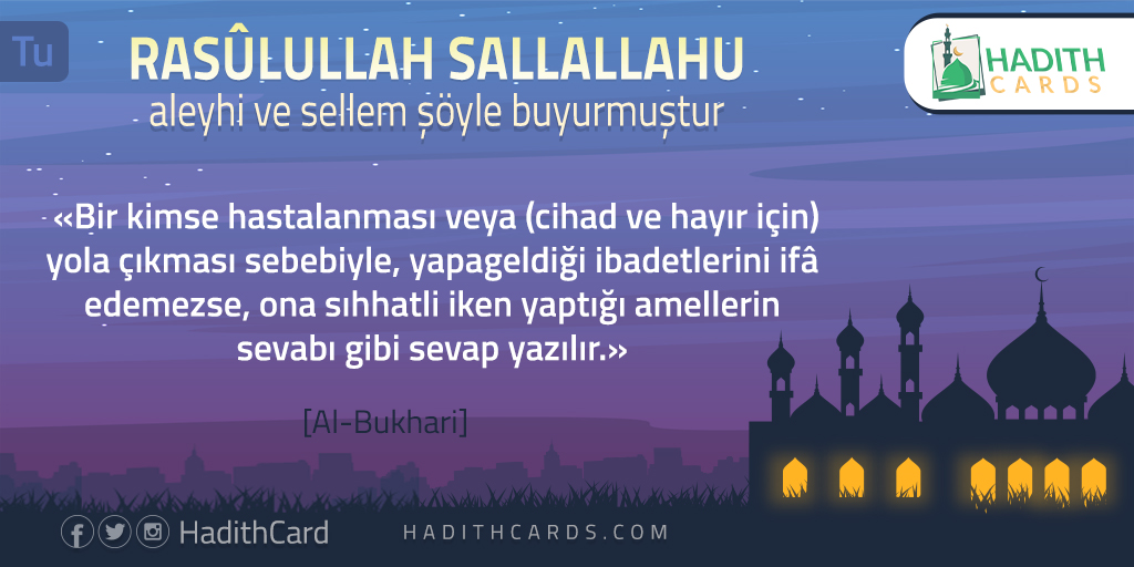 Bir kimse hastalanması veya (cihad ve hayır için) yola çıkması sebebiyle, yapageldiği ibadetlerini ifâ edemezse, ona sıhhatli iken yaptığı amellerin sevabı gibi sevap yazılır