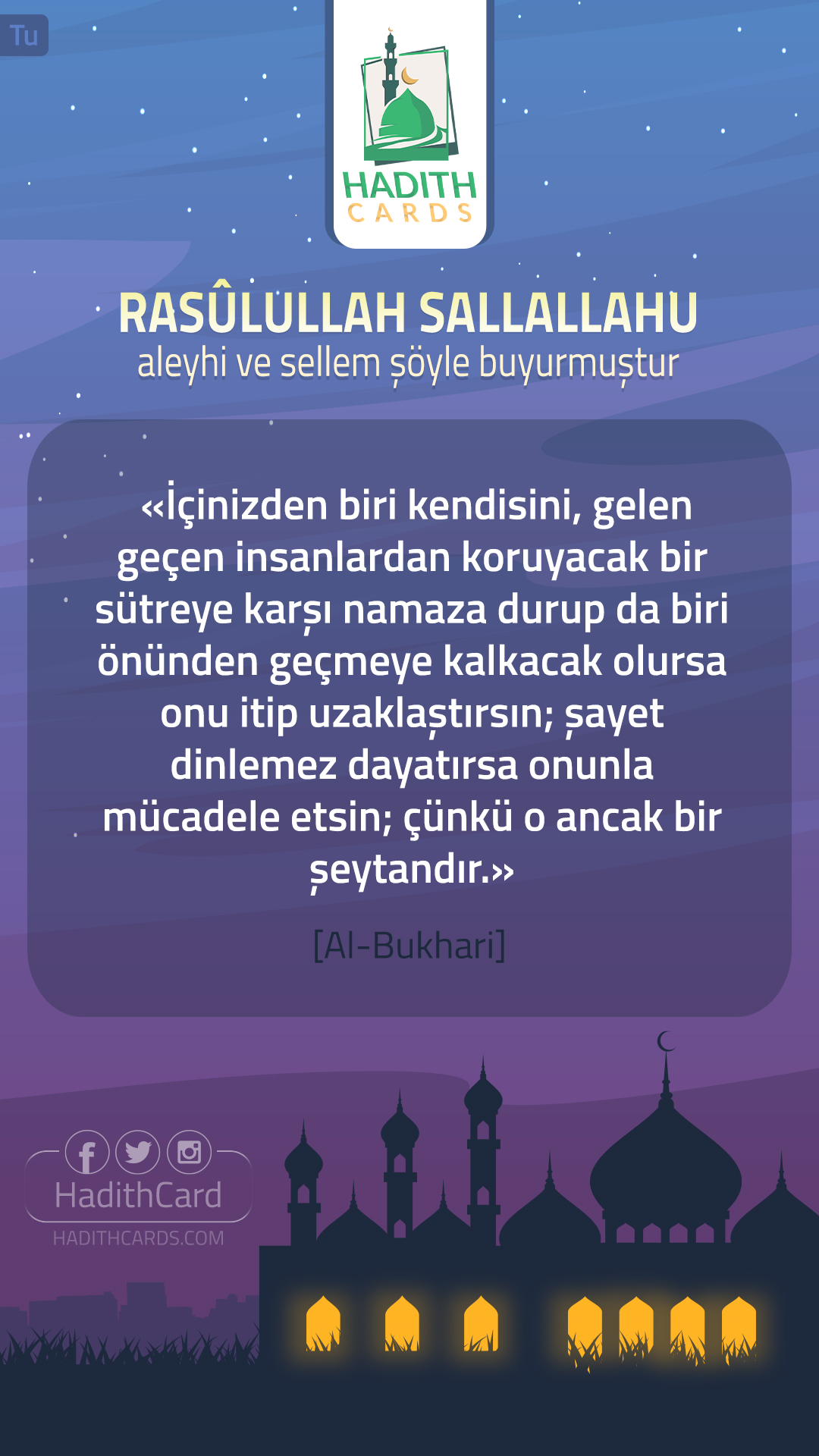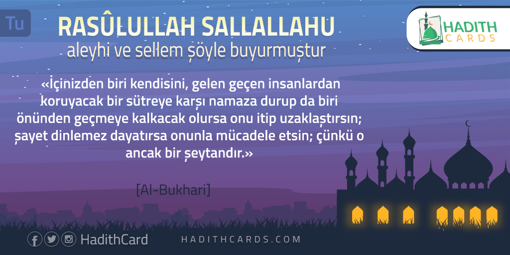 İçinizden biri kendisini, gelen geçen insanlardan koruyacak bir sütreye karşı namaza durup da biri önünden geçmeye kalkacak olursa onu itip uzaklaştırsın; şayet dinlemez dayatırsa onunla mücadele etsin; çünkü o ancak bir şeytandır