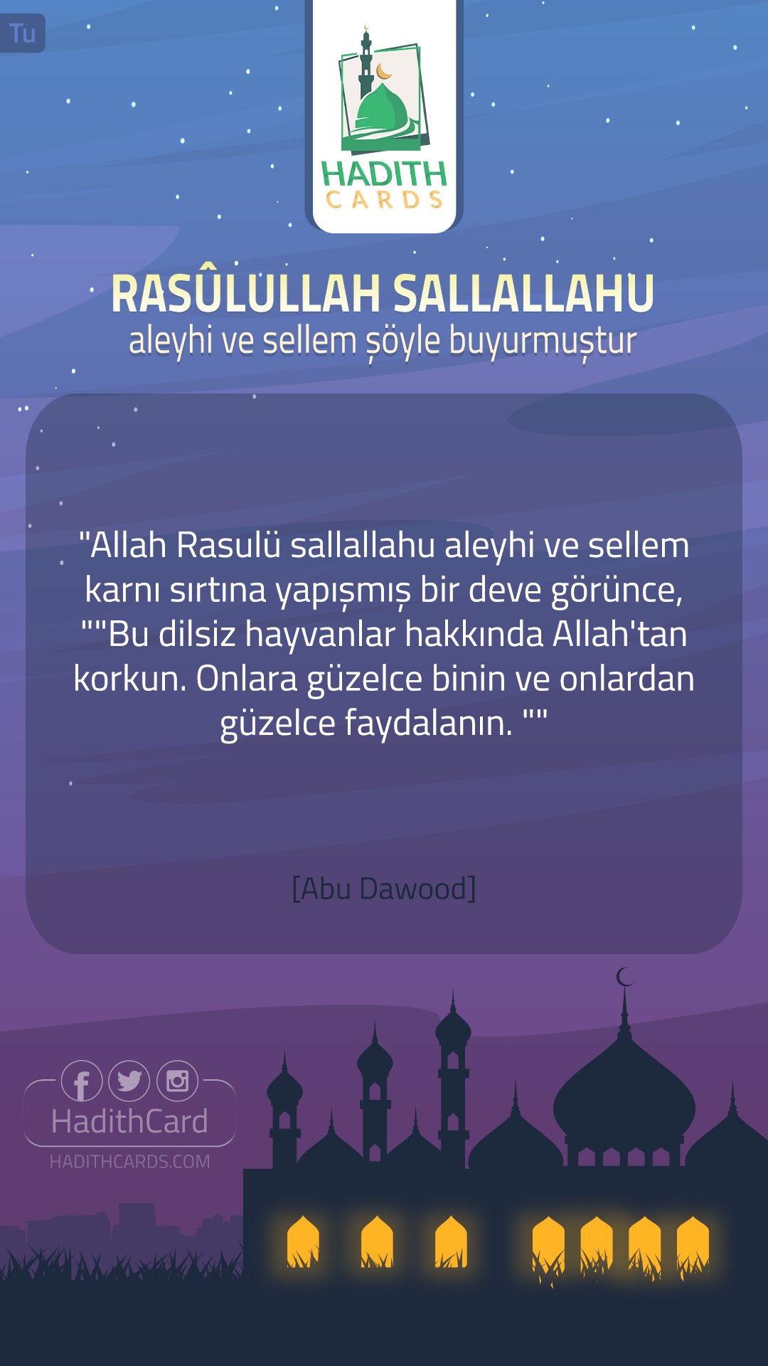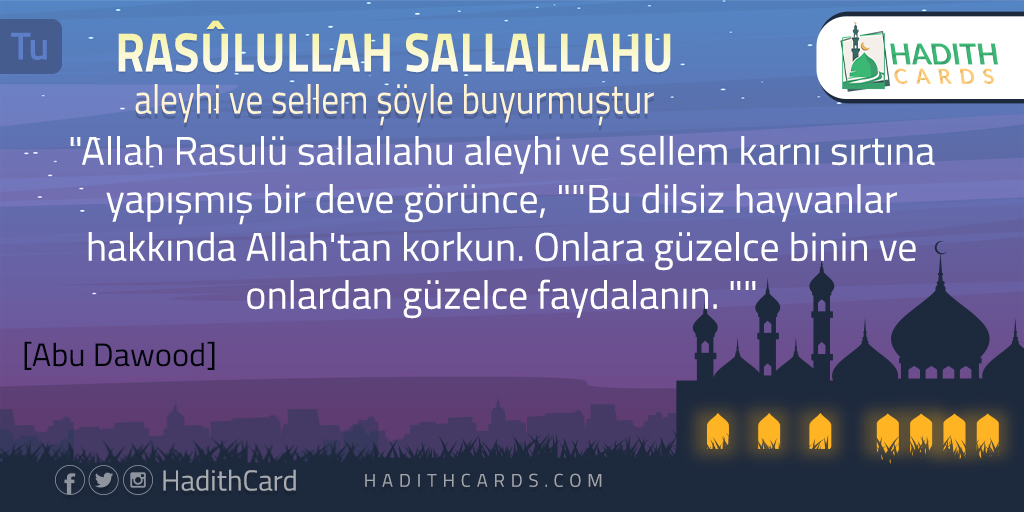 Allah Rasulü sallallahu aleyhi ve sellem karnı sırtına yapışmış bir deve görünce, "Bu dilsiz hayvanlar hakkında Allah'tan korkun. Onlara güzelce binin ve onlardan güzelce faydalanın