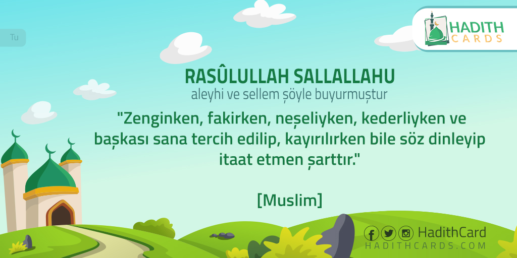 Zenginken, fakirken, neşeliyken, kederliyken ve başkası sana tercih edilip, kayırılırken bile söz dinleyip itaat etmen şarttır