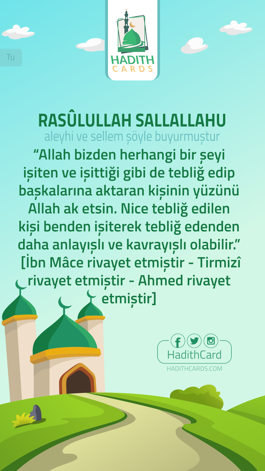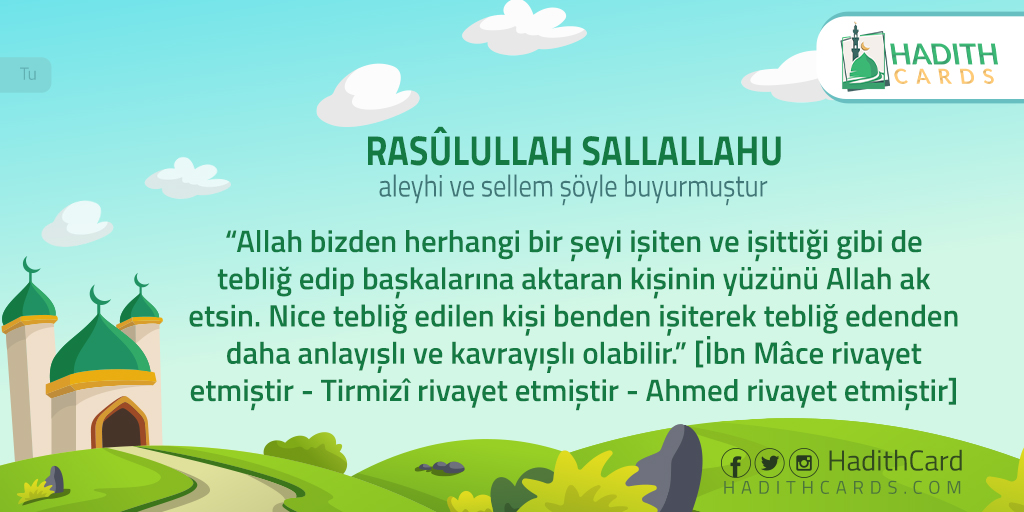 Allah bizden herhangi bir şeyi işiten ve işittiği gibi de tebliğ edip başkalarına aktaran kişinin yüzünü Allah ak etsin. Nice tebliğ edilen kişi benden işiterek tebliğ edenden daha anlayışlı ve kavrayışlı olabilir