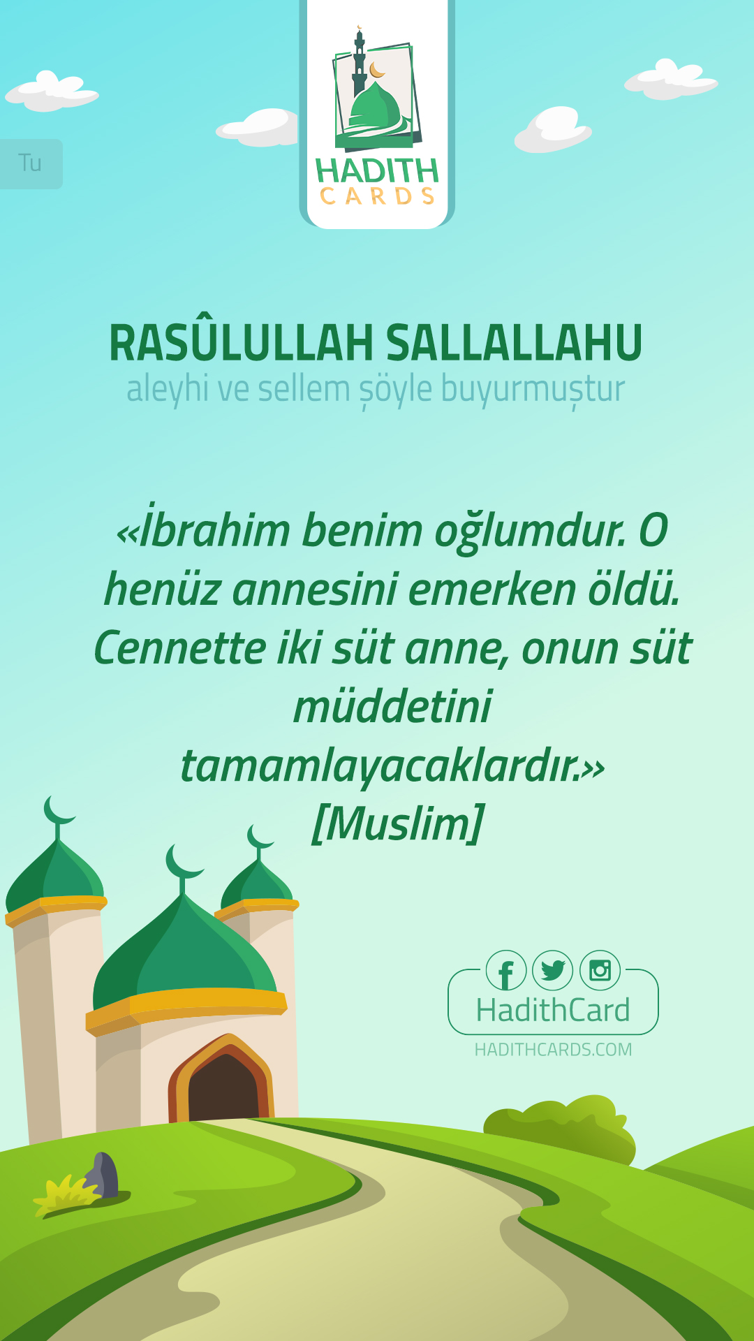 «إن إبراهيم ابني، وإنه مات في الثَّدي، وإن له لظِئْرين تُكمِلان رضاعه في الجنة». [مسلم]