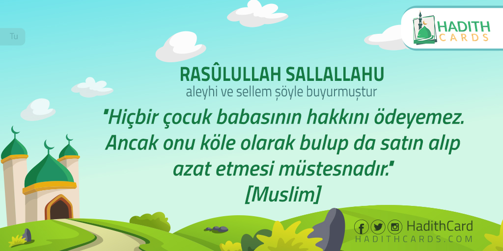 Hiçbir çocuk babasının hakkını ödeyemez. Ancak onu köle olarak bulup da satın alıp azat etmesi müstesnadır