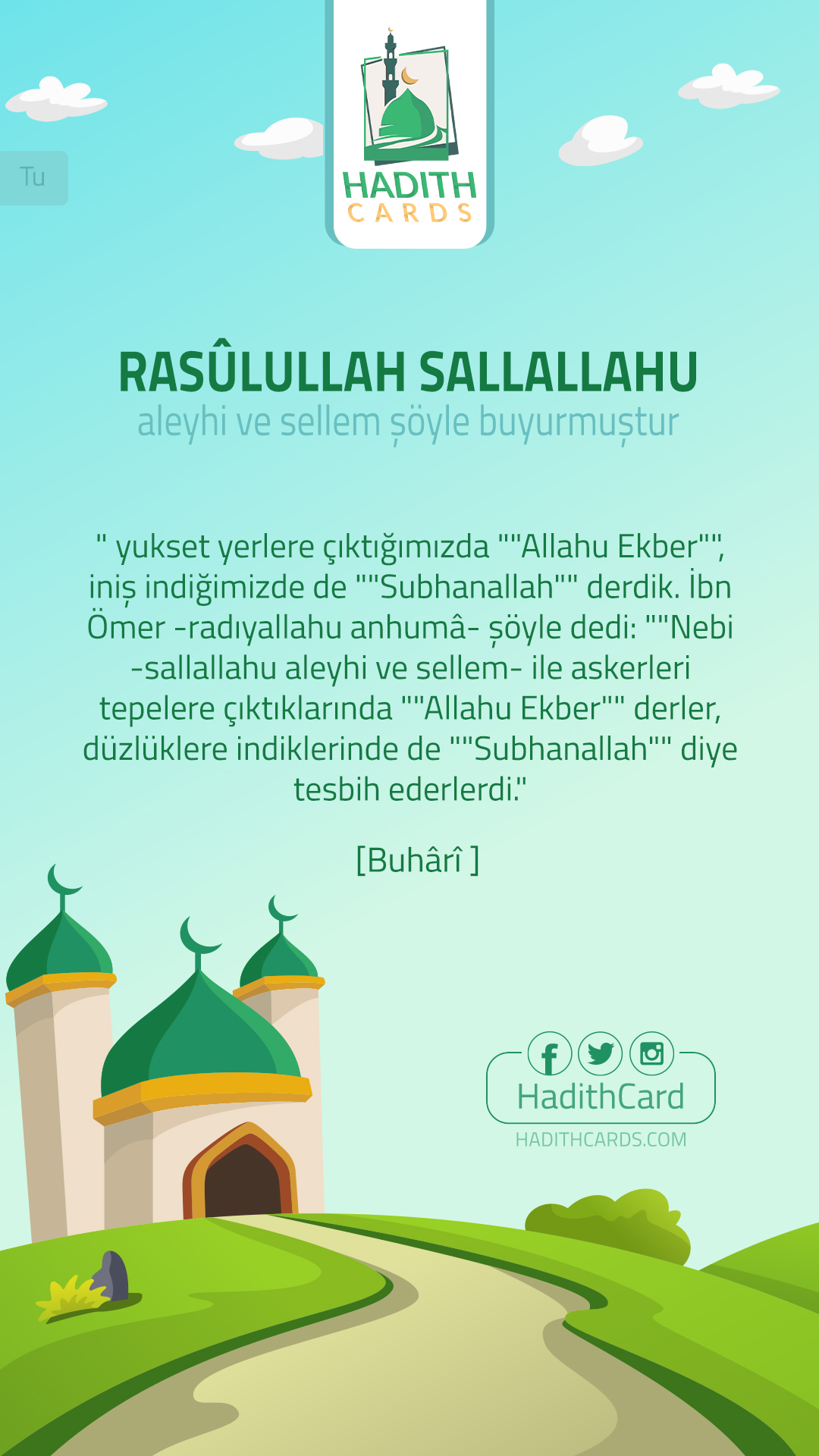 Allahu Ekber", iniş indiğimizde de "Subhanallah" derdik. İbn Ömer -radıyallahu anhumâ- şöyle dedi: "Nebi -sallallahu aleyhi ve sellem- ile askerleri tepelere çıktıklarında "Allahu Ekber" derler, düzlüklere indiklerinde de "Subhanallah" diye tesbih ederlerdi