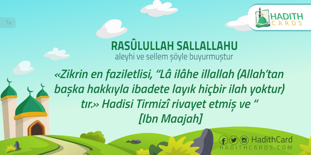 Zikrin en faziletlisi, “Lâ ilâhe illallah (Allah’tan başka hakkıyla ibadete layık hiçbir ilah yoktur) tır.» Hadisi Tirmizî rivayet etmiş ve