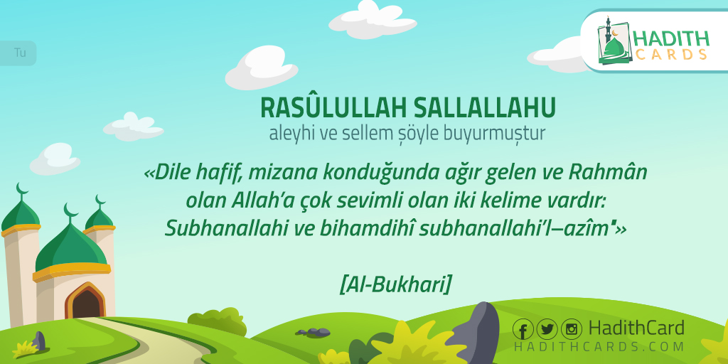 Dile hafif, mizana konduğunda ağır gelen ve Rahmân olan Allah’a çok sevimli olan iki kelime vardır: Subhanallahi ve bihamdihî subhanallahi’l–azîm