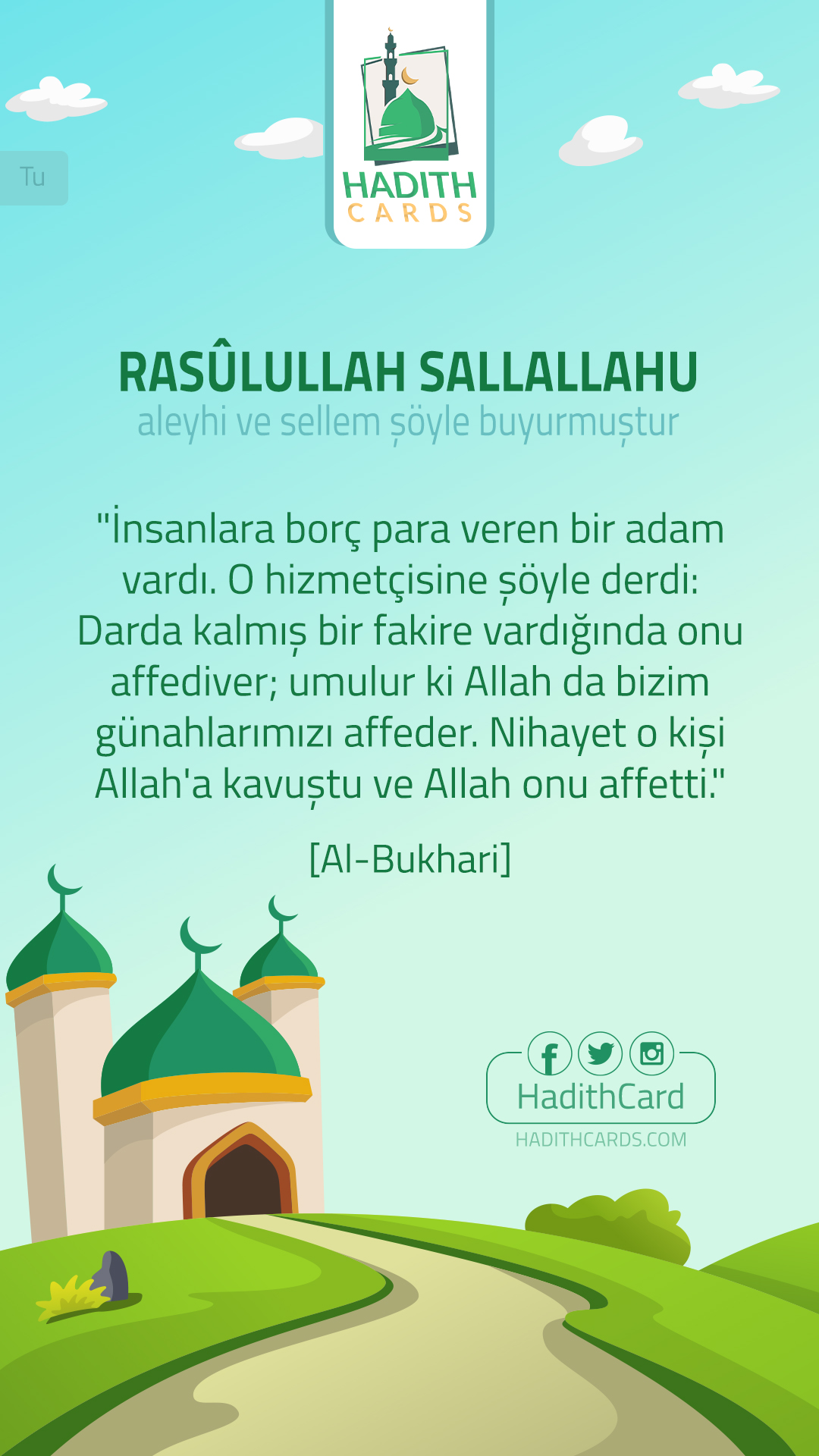 İnsanlara borç para veren bir adam vardı. O hizmetçisine şöyle derdi: Darda kalmış bir fakire vardığında onu affediver; umulur ki Allah da bizim günahlarımızı affeder. Nihayet o kişi Allah'a kavuştu ve Allah onu affetti