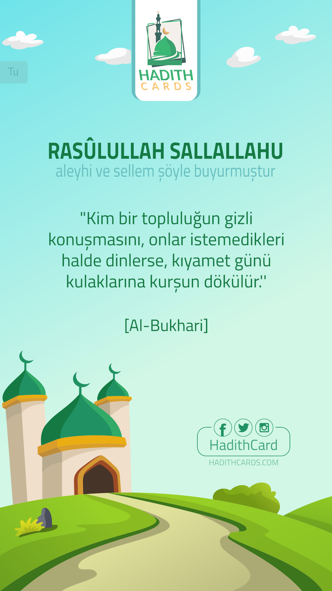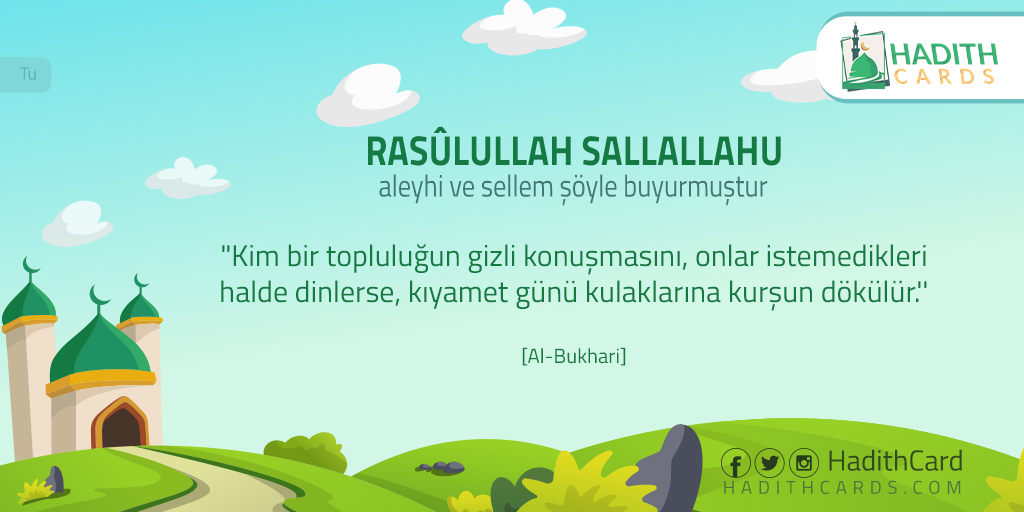 Kim bir topluluğun gizli konuşmasını, onlar istemedikleri halde dinlerse, kıyamet günü kulaklarına kurşun dökülür