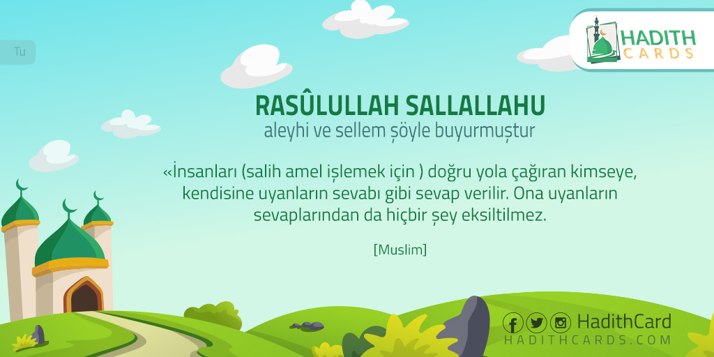 "«مَن دَعَا إلى هُدى، كَان لَه مِنَ الأَجر مِثل أُجُور مَن تَبِعَه، لاَ يَنقُصُ ذلك مِن أُجُورِهِم شَيئًا، ومَنْ دَعَا إلى ضَلاَلَة، كان عَلَيه مِن الإِثْم مِثل آثَامِ مَن تَبِعَه، لاَ يَنقُصُ ذلك مِن آثَامِهِم شَيْئًا».