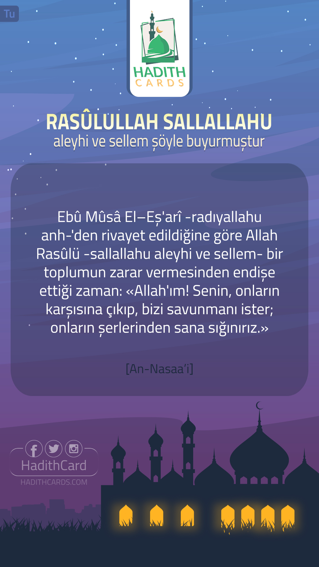 "عن أبي موسى الأشعري -رضي الله عنه- كَانَ إذا خَافَ قوماً، قالَ: «اللَّهُمَّ إنَّا نَجْعَلُكَ في نُحُورِهِمْ، وَنَعُوذُ بِكَ مِنْ شُرُورِهِمْ».
