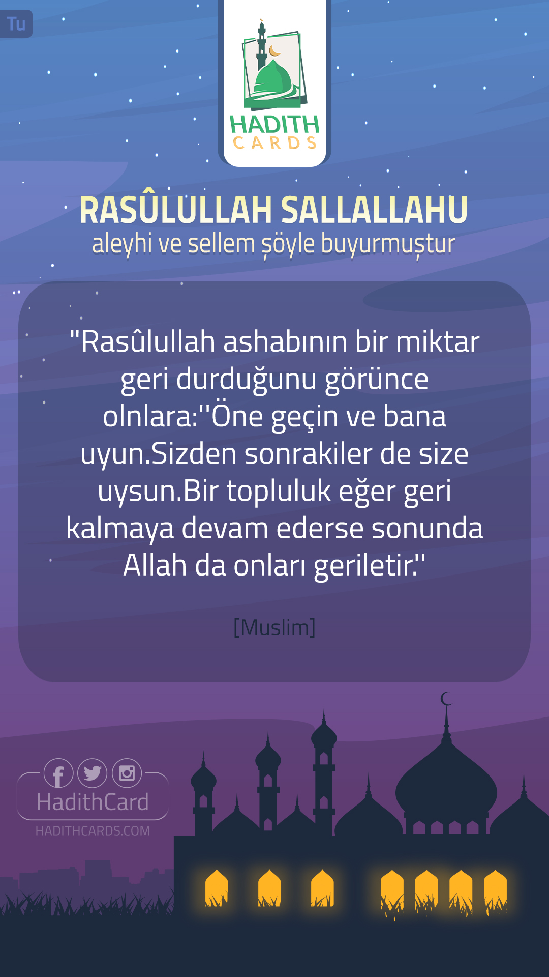 Rasûlullah ashabının bir miktar geri durduğunu görünce olnlara:''Öne geçin ve bana uyun.Sizden sonrakiler de size uysun.Bir topluluk eğer geri kalmaya devam ederse sonunda Allah da onları geriletir