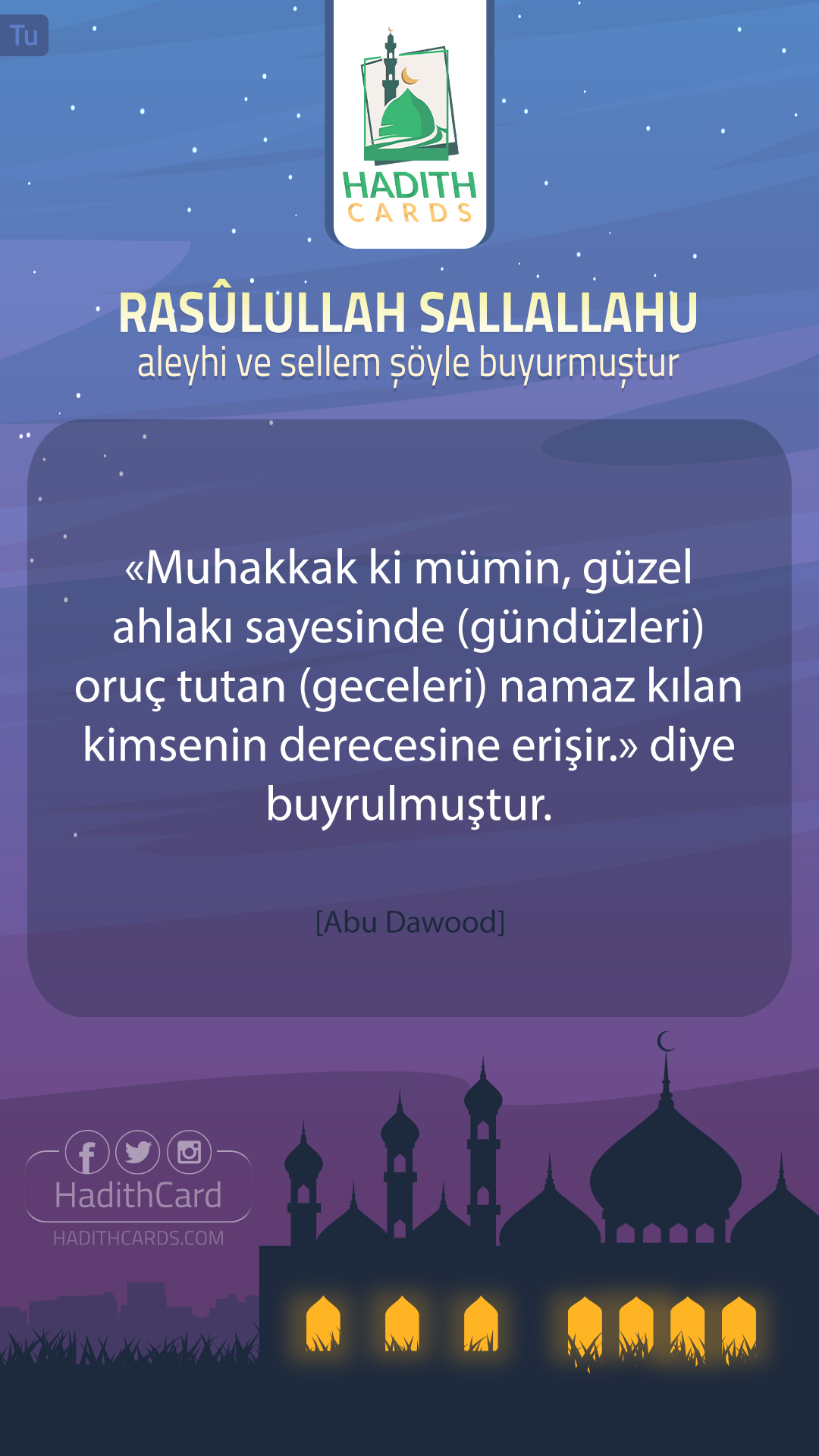 Muhakkak ki mümin, güzel ahlakı sayesinde (gündüzleri) oruç tutan (geceleri) namaz kılan kimsenin derecesine erişir.» diye buyrulmuştur