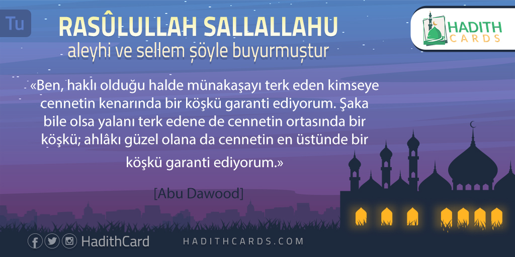 Ben, haklı olduğu halde münakaşayı terk eden kimseye cennetin kenarında bir köşkü garanti ediyorum. Şaka bile olsa yalanı terk edene de cennetin ortasında bir köşkü; ahlâkı güzel olana da cennetin en üstünde bir köşkü garanti ediyorum