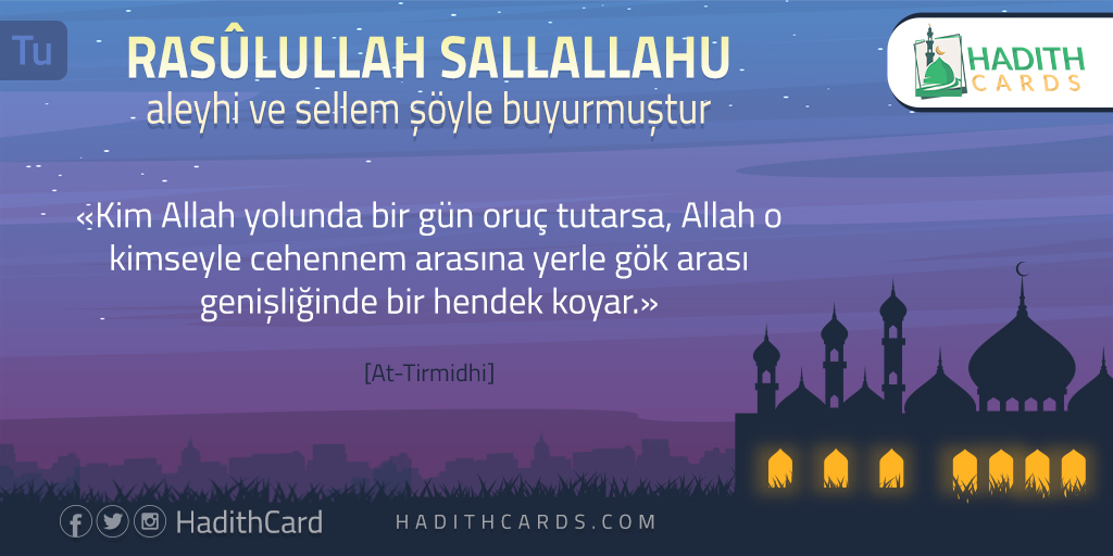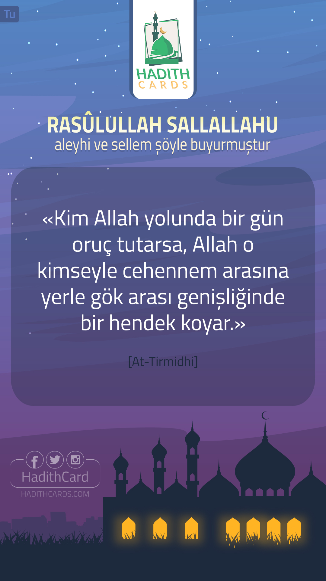 Kim Allah yolunda bir gün oruç tutarsa, Allah o kimseyle cehennem arasına yerle gök arası genişliğinde bir hendek koyar