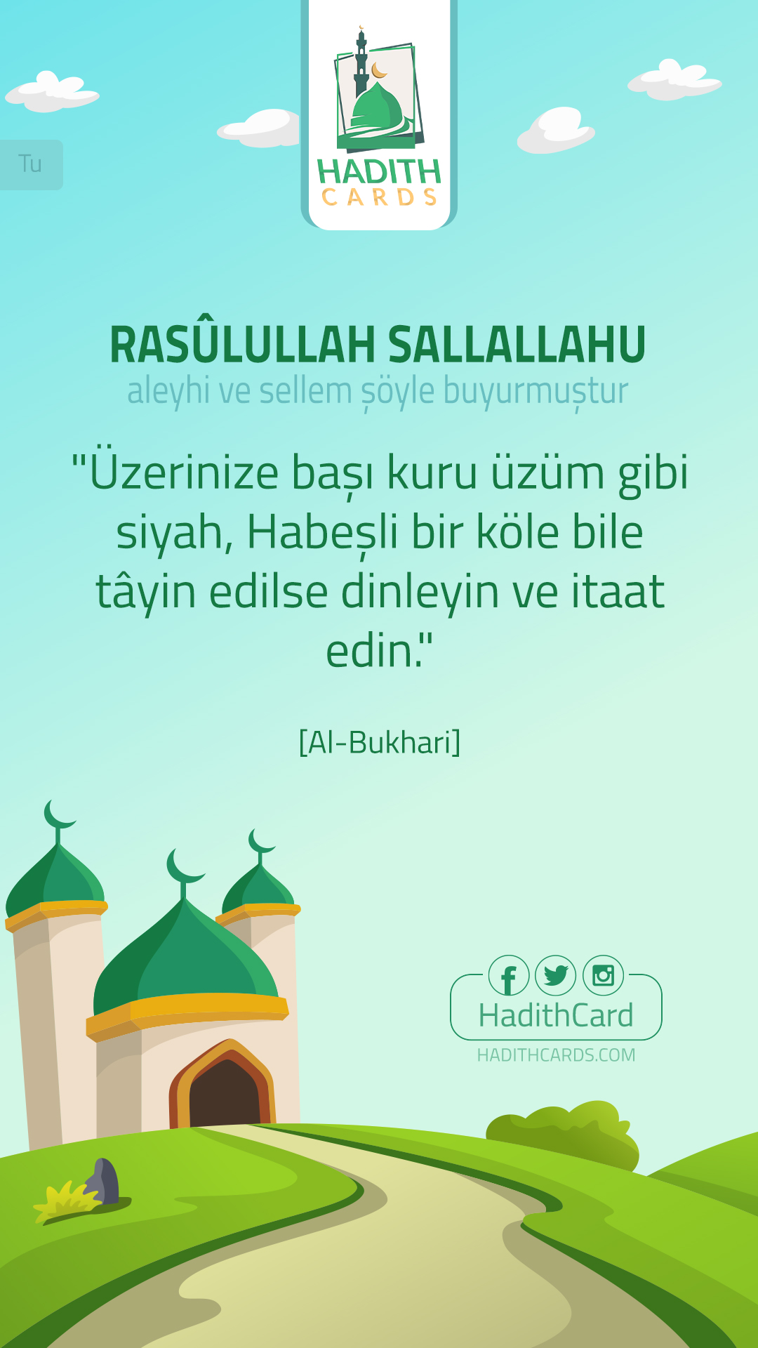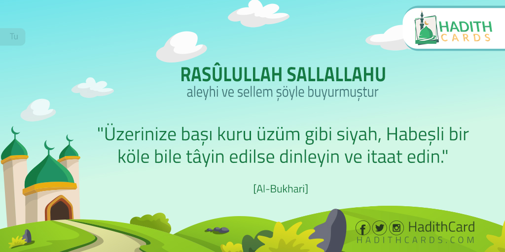 «اسمعوا وأطيعوا، وإن استعمل عليكم عبد حبشي، كأن رأسه زبيبة». (البخاري)
