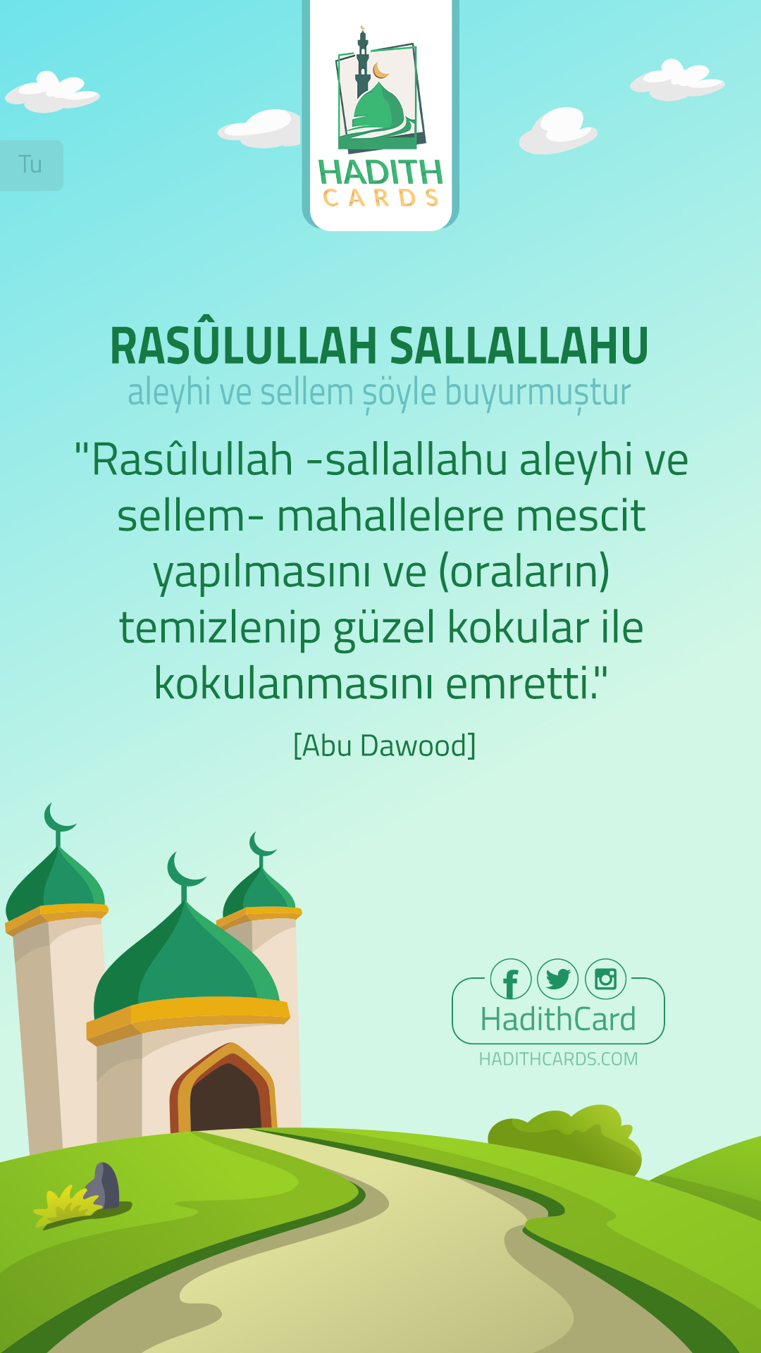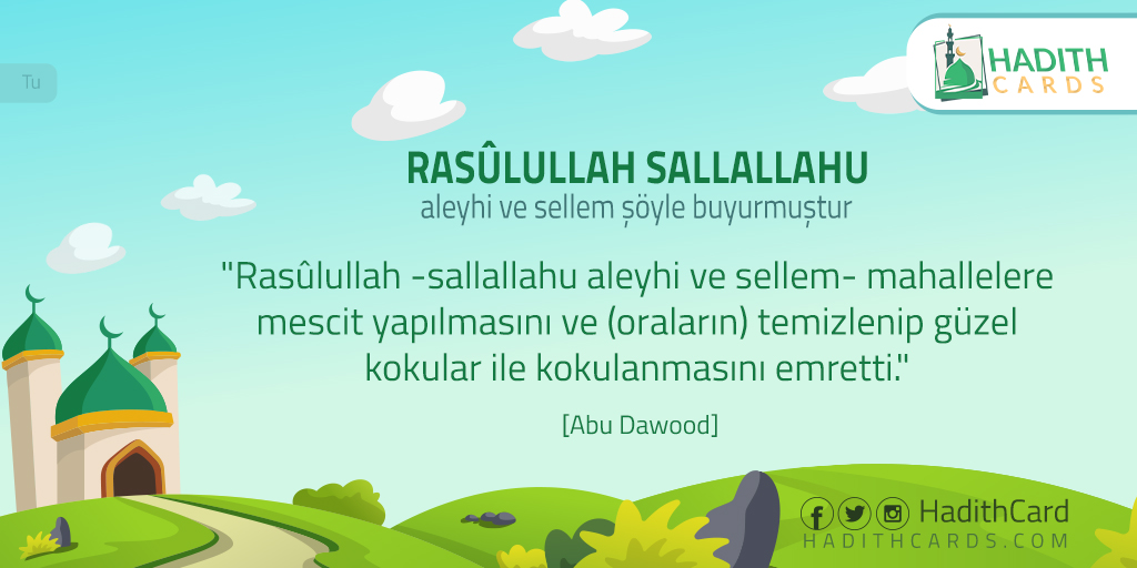 أَمَر رسول الله -صلى الله عليه وسلم- بِبناء المساجد في الدُّورِ، وأن تُنظَّف، وتُطيَّب (أبو داود)